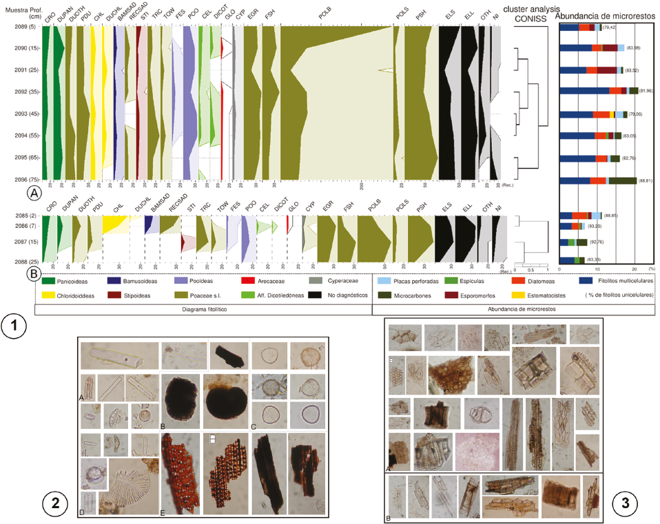 De acuerdo con el cluster analysis, los elementos panicoides caracterizan todo el perfil, mientras que otros elementos megatérmicos de condiciones secas (chloridoides) solo se presentan en los niveles superficiales, y los micro/mesotérmicos (tales como los pooides y estipoides) resultaron abundantes solo en la muestra 2087.