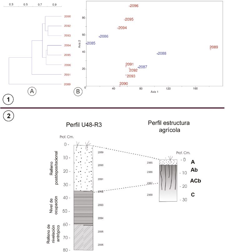 El análisis comparativo de las muestras de ambos perfiles se realizó aplicando análisis numéricos multivariados, en particular el cluster analysis y análisis de correspondencia (DCA Detrented Correspondence Analysis sensu Hill y Gauch 1980), utilizando el programa PAST (Hammer et al. 2001).