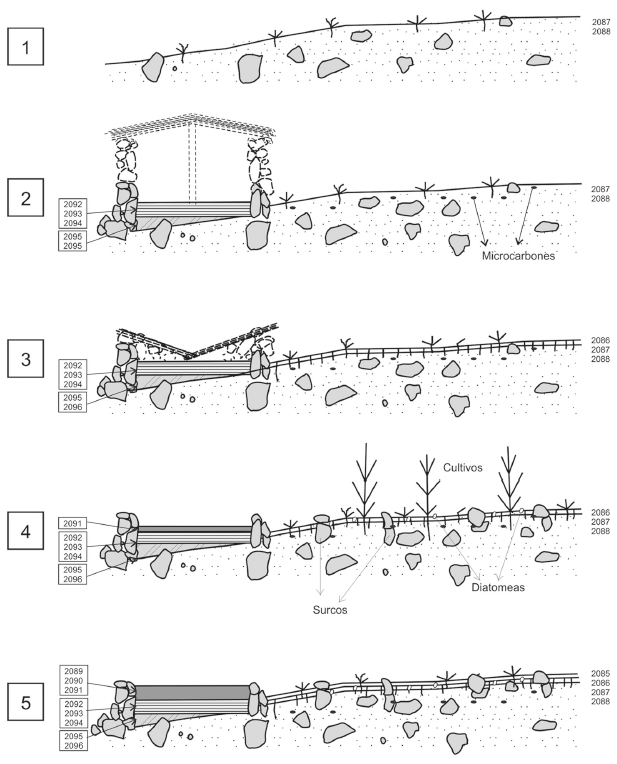 La primera y más evidente modificación antrópica de este perfil está representada por los alineamientos de piedra subparalelos entre sí, semienterrados en el perfil, que delimitan el suelo cultivado. Como ya se indicó, el análisis estratigráfico mostró la presencia de dos ciclos pedológicos: el reciente, representado por un horizonte A, con marcadas diferenciaciones de los horizontes Ab-A/Cb-C subyacentes. Los valores de materia orgánica y fósforo también permiten reconocer que el ciclo pedológico inferior presenta un mayor desarrollo, vinculado a la etapa de producción agrícola. El bajo nivel de fósforo en el horizonte Ab puede vincularse al aprovechamiento intensivo de este suelo.