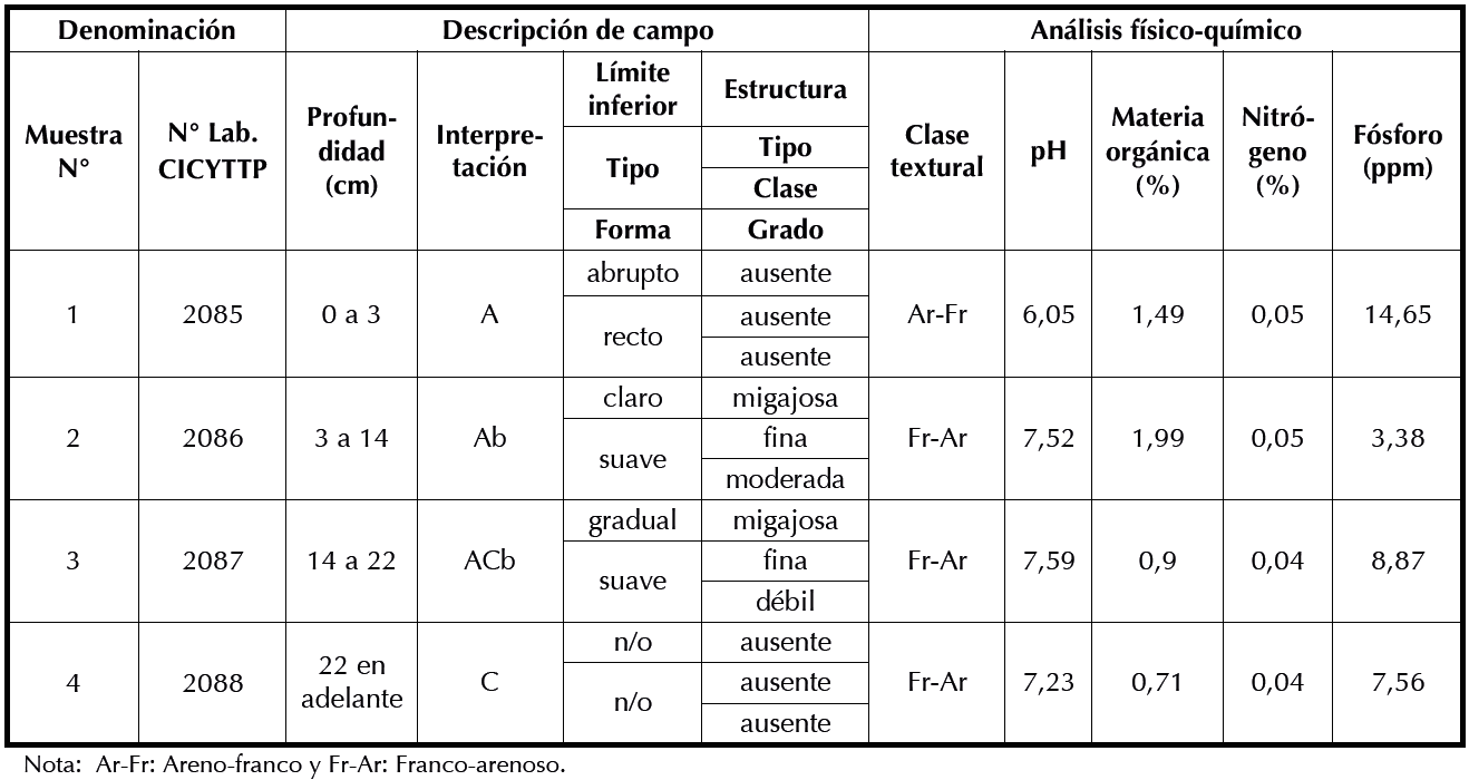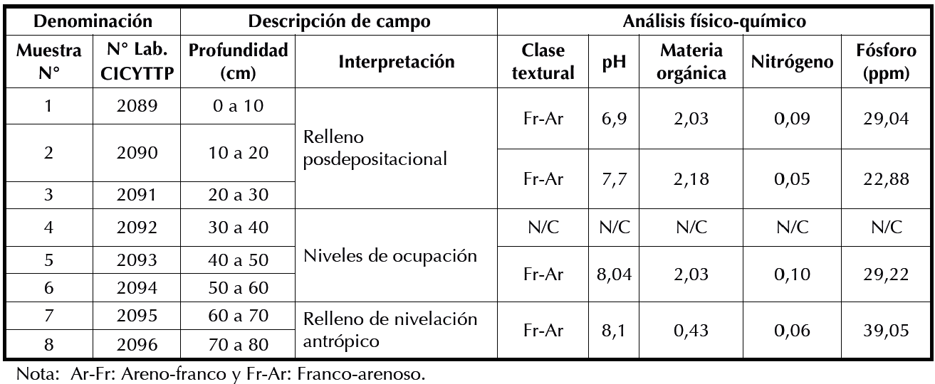 Desde el punto de vista pedoestratigráfico se reconocen dos ciclos, uno superior de horizonte A (muestra 2085) de textura areno-arcillosa y escaso desarrollo, que se dispone mediante una discontinuidad litológica sobre un ciclo inferior de horizontes Ab-A/Cb-Cb (muestras 2086, 2087 y 2088). El análisis fisicoquímico de la secuencia refuerza esta interpretación, con cambios notables en textura y estructura, en valores de pH, materia orgánica y fósforo (Tabla 1).