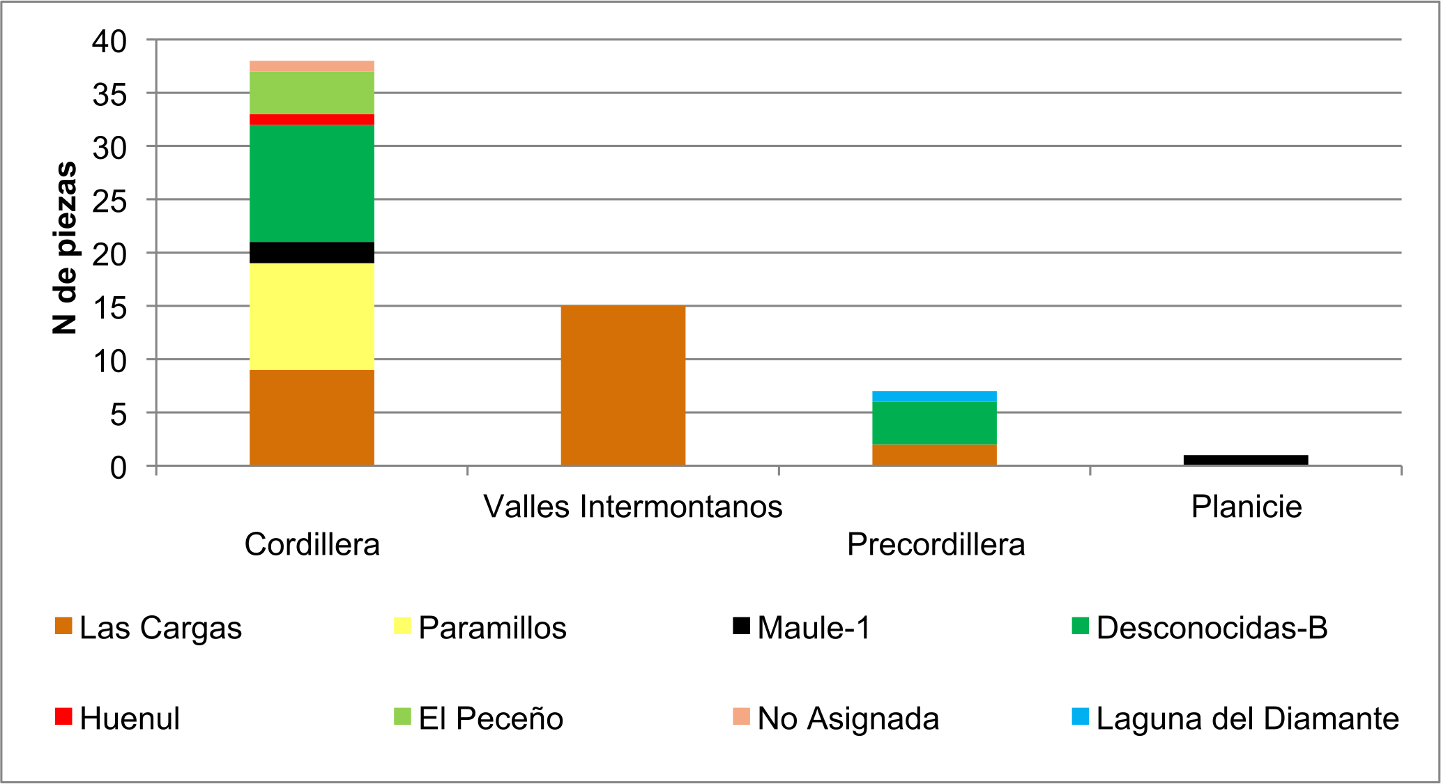 La mayor parte de las piezas fueron recuperadas en estratos de aleros y reparos rocosos localizados en cordillera y precordillera, con representaciones que alcanzan un máximo de 0,5%. Es una excepción el ajuar del enterratorio de Uspallata Usina Sur, con 14 puntas talladas en obsidiana. En los valles intermontanos se practicaron grandes excavaciones, particularmente en Potrerillos, donde se estudiaron unidades domésticas en terrazas de ambas márgenes del río Mendoza (Cortegoso et al. 2014). No obstante, estos ambientes muestran muy baja presencia de obsidiana. De igual modo, se han excavado sitios con unidades domésticas y cementerios en planicie, como Capiz Alto y Barrancas (Durán y Novellino 2003; Novellino et al. 2013), donde dicha tendencia es aún más marcada.