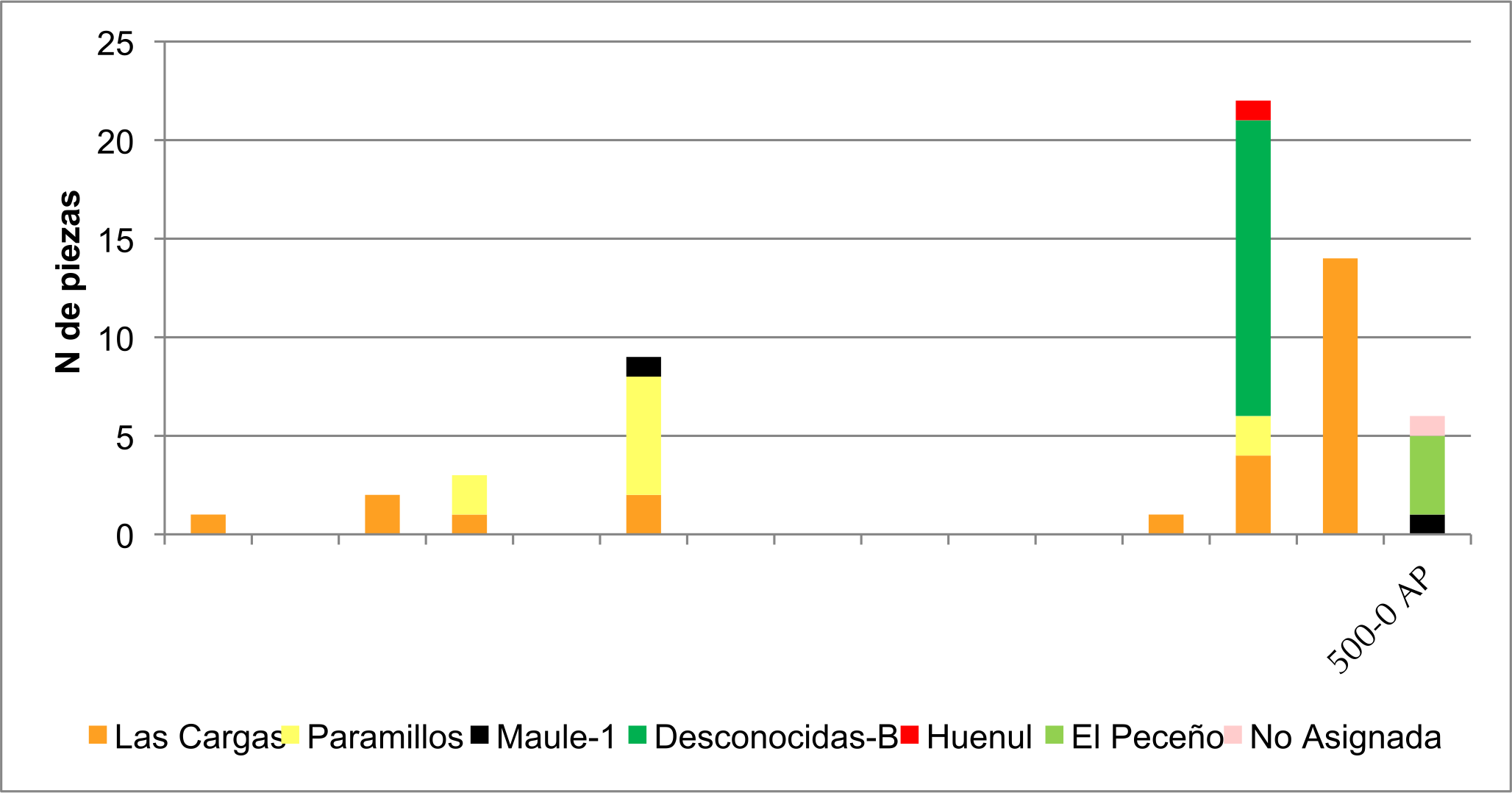 El siguiente rango temporal solo tiene registro de LC y corresponde en su totalidad al ajuar de Usina Sur, cuya cronología lo ubica en el límite temporal de la instalación del Imperio en la región (Marsh et al. 2017). El registro más tardío e incluso poscontacto marca una diferencia significativa. En Capiz, un contexto correspondiente al primer siglo de contacto registra la fuente de cordillera más distante LM1. Aparece en esta fracción temporal una señal NA y por primera vez la fuente extracordillerana EP. Esta última se registra en el estrato superficial de El Piedrón, que tiene materiales tardíos alternados con modernos; único estrato que registra acceso a bienes provenientes de un área extracordillerana cuya circulación, aun en el área de influencia de la fuente, no supera los 1000 años AP (Cortegoso et al. 2012).