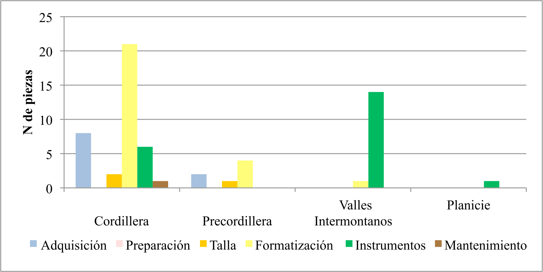 En cordillera y precordillera existe mayor variabilidad de productos de talla y artefactos (Tabla 1 y Figura 4). La formatización y el mantenimiento de artefactos representan el 57% de los elementos de obsidiana en la cordillera y el 66% en la precordillera, esto es significativo en los registros más tempranos. Además, en cordillera, casi el 13% de la muestra está integrada por fragmentos de artefactos y puntas de proyectil (fracturadas). En los ambientes de altura solo están representadas las etapas finales de las secuencias reductivas de instrumentos, como por ejemplo el mantenimiento y descarte de armas de caza que perdieron su vida útil. Esto denota actividades posiblemente vinculadas al mantenimiento de artefactos en uso que formaban parte de un tool kit transportable (sensu Binford 1980).