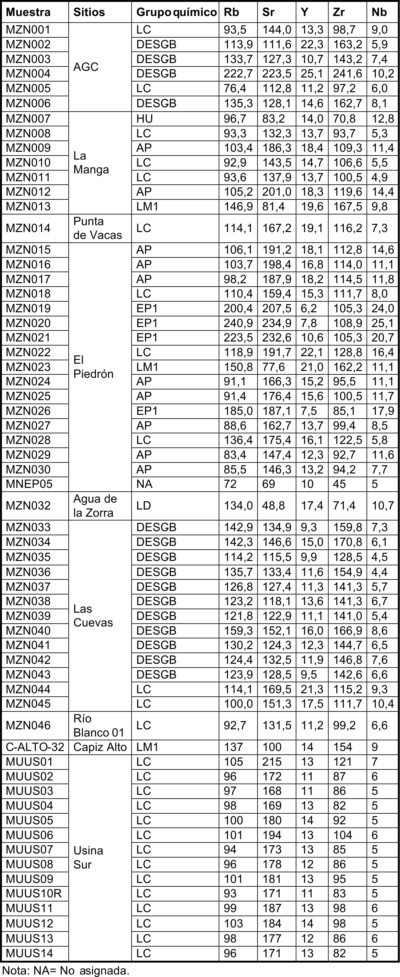 A excepción de las puntas que integran el ajuar de Usina Sur y la muestra de Capiz Alto, todos los artefactos se analizaron en 2017 mediante fluorescencia de rayos X dispersiva de energía no destructiva (ED-XRF) utilizando un instrumento portátil propiedad del MURR en préstamo a la Universidad de Cuyo en Mendoza6. La asignación de fuentes implicó comparaciones entre los datos de composición para los artefactos y la base de datos de obsidiana MURR XRF y NAA para fuentes en Argentina. Los resultados de asignación para muestras arqueológicas de toda la provincia de Mendoza permiten graficar las señales químicas de las fuentes regionales, como así también dos elipses que agrupan muestras con similitudes químicas (Desconocidas A y B) pero de las cuales se desconoce la localización espacial de la fuente. En este estudio, todas las mediciones de XRF emplearon un espectrómetro de dispersión de energía Bruker Tracer-5i XRF. Cada muestra se analizó durante un minuto para facilitar las mediciones de los siguientes elementos: K, Ca, Ti, Mn, Fe, Rb, Sr, Y, Zr y Nb. Sin embargo, para fines de suministro, los elementos más importantes son: Rb, Sr, Y, Zr y Nb. La calibración del Tracer-5i se realizó midiendo un conjunto de 40 muestras de fuentes de obsidiana previamente estudiadas mediante análisis de activación de neutrones (NAA), espectrometría de masa plasmática acoplada inductivamente (ICP-MS) y XRF (Glascock y MacDonald 2018).
