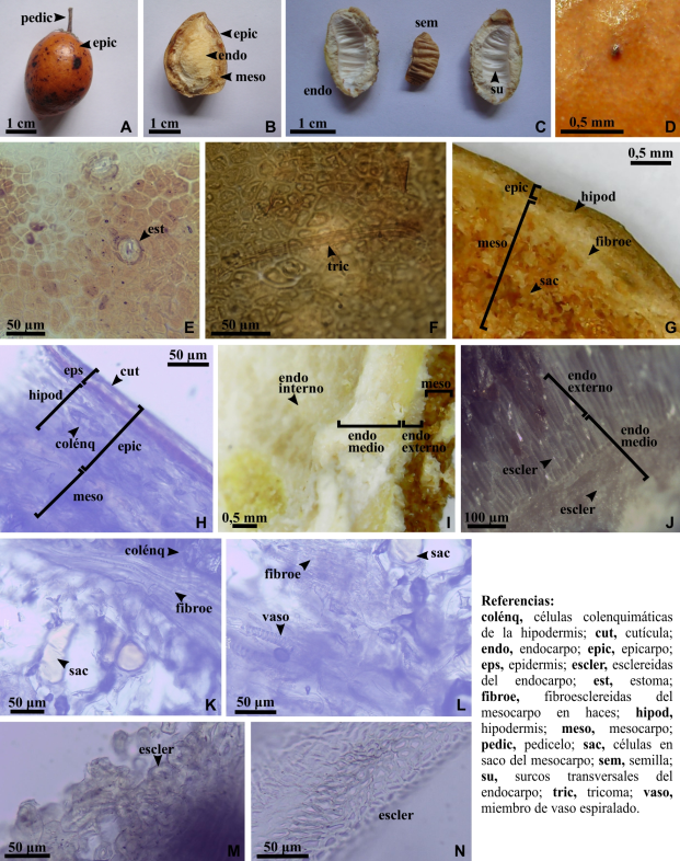 Morfología interna y externa del fruto de chañar. A: vista exterior; B: corte longitudinal; C: vista interna del endocarpo en corte longitudinal por la línea de sutura y semilla. Se aprecia superficie ondulada de esta última; D: epicarpo en vista superficial. Se observa glabro y liso; E y F: epidermis en vista superficial; G y H: capas histológicas externas en corte transversal; I y J: corte transversal por endocarpo; K: epicarpo interno y mesocarpo. Se observan cuatro capas de fibroesclereidas del mesocarpo; L: mesocarpo; M: esclereidas del endocarpo en corte transversal. Se observa pared engrosada; N: detalle de esclereidas de capa media del endocarpo con disposición irregular.