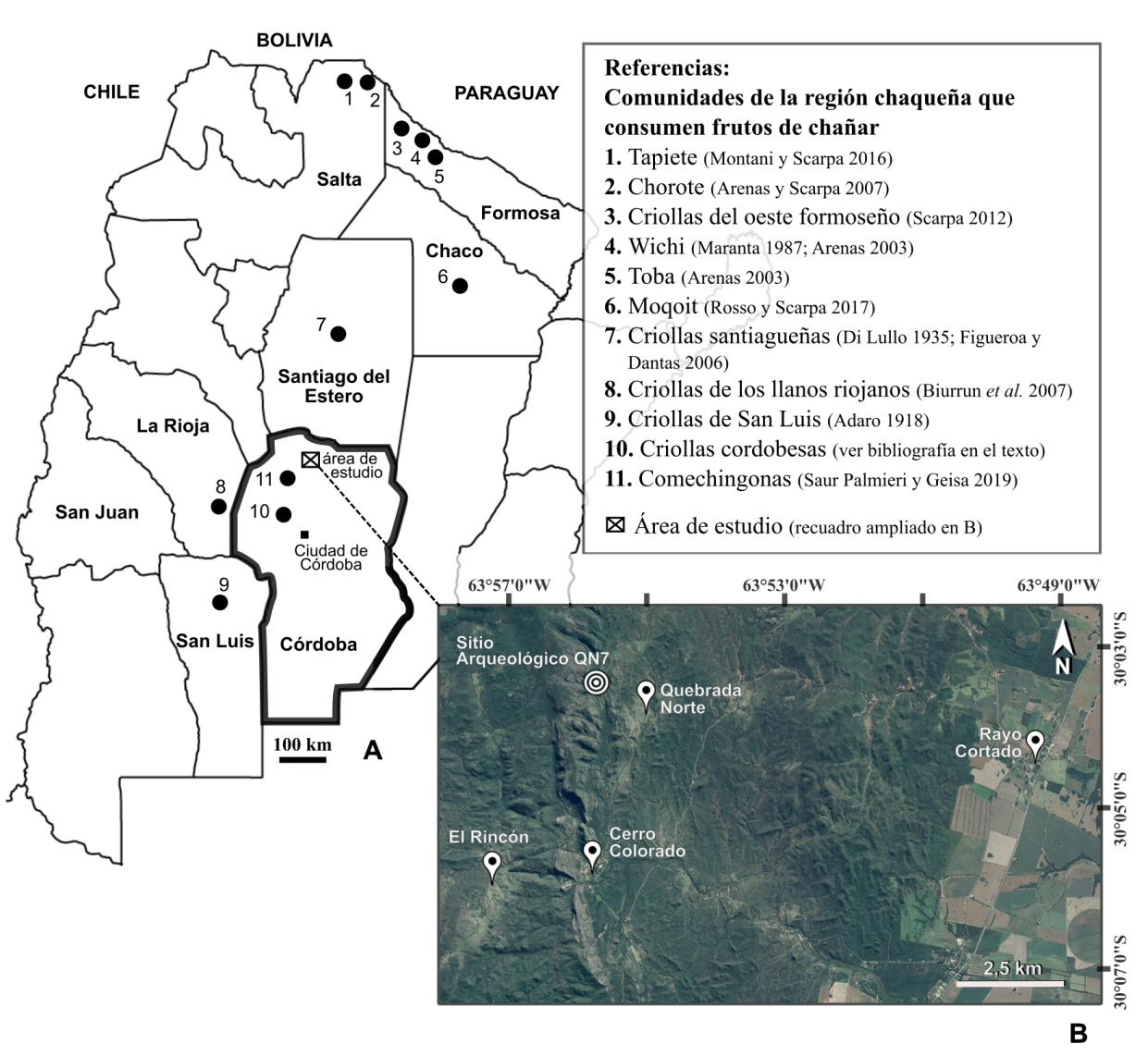 A. Ubicación de las comunidades chaqueñas argentinas que consumen chañar y posición relativa del área de estudio en el noroeste de la provincia de Córdoba. B: Detalle del área de estudio: Cerro Colorado y alrededores, en relación con el sitio arqueológico QN7. Adaptación de imagen satelital (Google Inc., 2017).