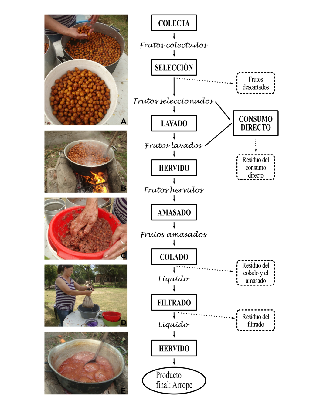 De la observación participante se obtuvieron muestras de los frutos procesados y residuos luego de cada una de las etapas de la cadena operativa. El producto final, el arrope, al corresponder a un jarabe sin restos visibles macroscópicamente, no fue analizado en el presente trabajo debido a que excede al objetivo propuesto.