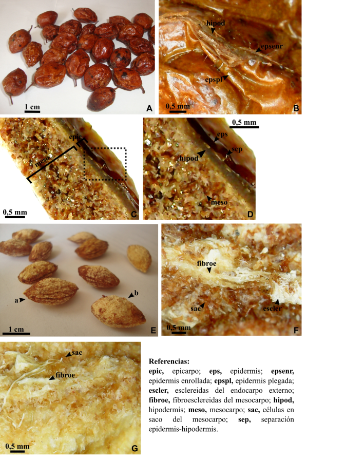 Frutos de chañar hervidos y residuo del consumo directo. A: vista general de frutos hervidos; B: detalle de la fractura de epicarpo y plegamiento de epidermis de fruto hervido. Se observa hipodermis por debajo de la epidermis enrollada en el borde de la fractura; C: corte transversal de fruto hervido; D: detalle del recuadro punteado en C, donde se observa separación de epidermis e hipodermis; E: vista general. Se observan endocarpos con distinto porcentaje de mesocarpo adherido: a) endocarpos con más del 50% de mesocarpo adherido y pátina oscura entre las rugosidades del endocarpo; b) endocarpos con menos del 50% de mesocarpo depositado principalmente en áreas distales; F: superficie de endocarpo de la categoría con más del 50% de mesocarpo, región de la sutura carpelar. Detalle de haces de fibroesclereidas dispuestas con su eje mayor paralelo a la línea de sutura; G: superficie de endocarpo de la categoría con menos del 50% de mesocarpo, región de la sutura carpelar. Se observan escasas células en saco del mesocarpo y haces de fibroesclereidas fragmentados y poco notorios a lo largo de la línea de sutura.
