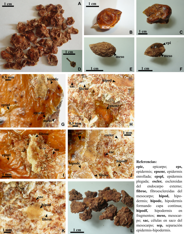 El 76,9 ± 18,4% de la masa del residuo del chaguado-colado está representado por endocarpos, todos enteros, sin fracturas. En su superficie se encuentran adheridos fragmentos del epicarpo y del mesocarpo (probablemente procedentes de varios frutos), en distinta proporción y con distinto grado de preservación, dependiendo de cuán amasado y frotado con el colador estuviera el endocarpo (Figura 5E, F, J, K y Tabla 1 del Material Complementario). Los fragmentos de epicarpo muestran epidermis e hipodermis, o solo hipodermis. El mesocarpo se observa poroso a simple vista, y sus haces de fibroesclereidas se encuentran principalmente en forma de pequeños fragmentos mezclados con las células en saco. También se destacan porciones de haces de fibroesclereidas con hipodermis (Figura 5 J, K).