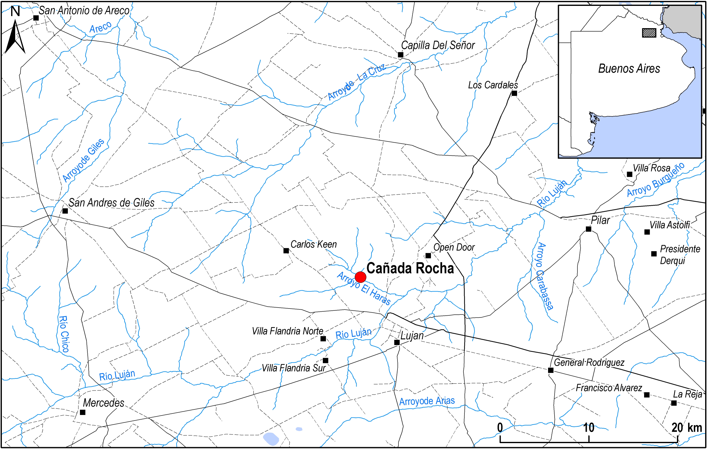 Ameghino describió la ubicación del sitio en las márgenes de la Cañada Rocha, y expresa que está en “la margen derecha de la cañada, a una legua poco más o menos de la embocadura del Arroyo Marcos Díaz [actual arroyo El Haras, afluente del río Luján], del que es una continuación y a unos 50 pasos antes de llegar a su principal bifurcación” (Ameghino [1880-1881] 1915: 384). A pesar de cierta imprecisión en esta descripción, Salemme ubicó el sitio a 34º 31´ S y a 59º 09´ O (Salemme 1983, 1987). Recientemente, Lanzelotti et al. (2016) reubicaron el sitio sobre la base de la bibliografía y de cierta tradición oral local a los 34° 30’ 49,50” S y 59° 08’ 37,13” O (Figura 1).