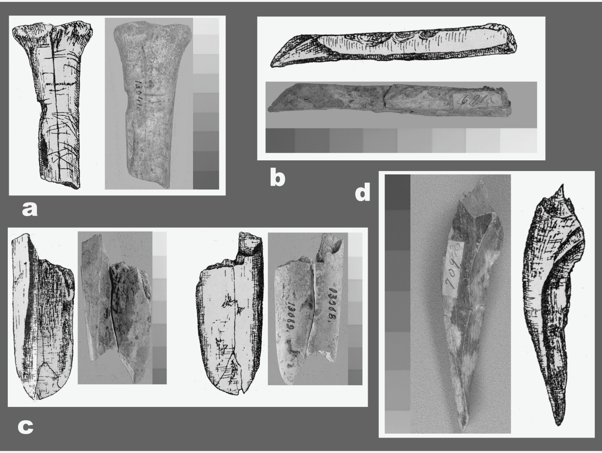 Comparación de algunos especímenes representados en La Antigüedad del Hombre en el Plata y presentes en la colección. Fotografías a y b) corresponden a Fig. 453 y Fig. 445 de Lámina XIV; Fotografías c y d) corresponden a Fig. 488, 489 y 470 de Lámina XV) en Ameghino ([1880-1881] 1915).