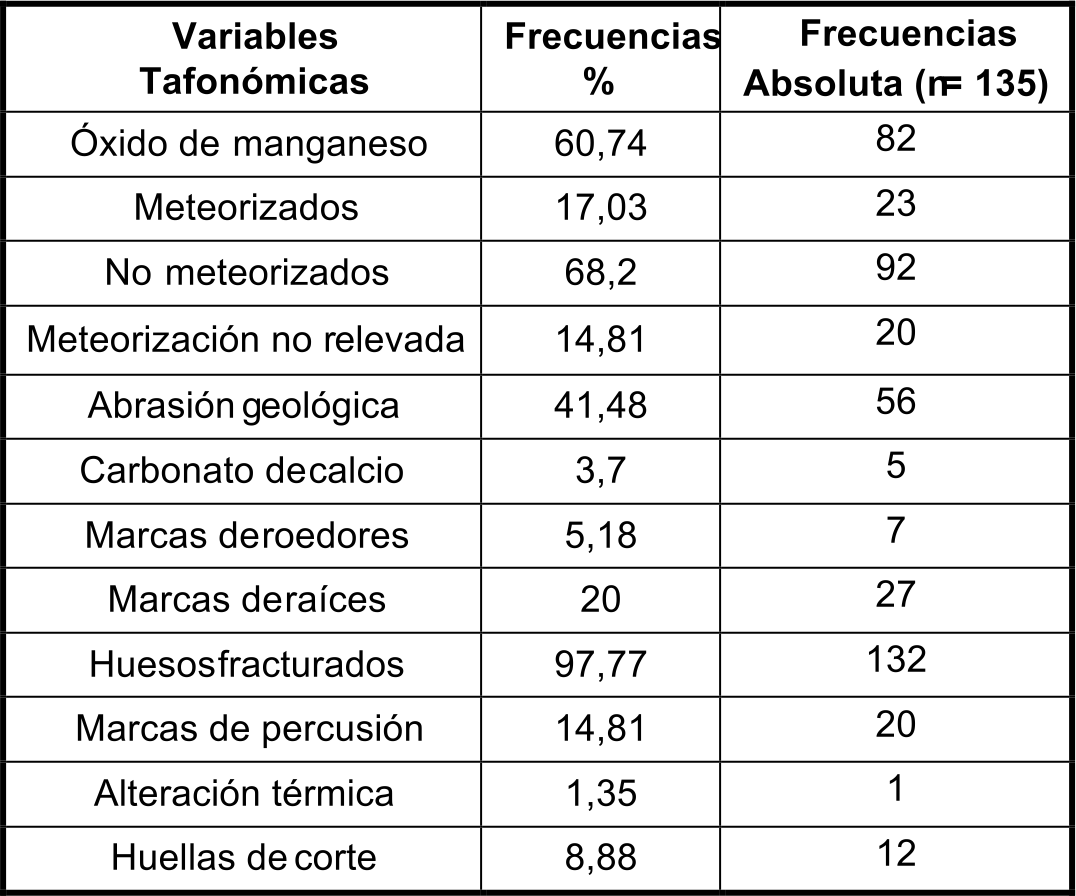 Los restos faunísticos fueron analizados macroscópica y microscópicamente, con una lupa binocular Nikon SMZ800 con aumentos de 1 a 6,3x. Se siguieron los criterios propuestos por diversos autores para el reconocimiento de las modificaciones óseas (Lyman 1994; Fisher 1995; Gutiérrez 2004). Las variables tafonómicas relevadas en la colección (Tabla 2) muestran las siguientes tendencias: elevadas proporciones de especímenes con óxido de manganeso (lo que indica un contexto de depositación con presencia de agua con un pH alcalino y condiciones oxidantes) (Dorn y Oberlander 1981; Fernández Jalvo y Andrews 2016) y de especímenes abradidos. La representación de los estadios 1 y 2 de abrasión (sensu Gutierrez y Kaufmann 2007) y el porcentaje elevado de esta variable sugieren la influencia del agua en la conformación del conjunto. Además, la mayoría de los huesos poseen una meteorización nula (68,2%) y entre los meteorizados (n = 23), el 65,2% están en el estadio 1, lo que indica que fueron sepultados rápidamente y que luego fueron afectados principalmente por las raíces y escasamente por los roedores. El elevado porcentaje de huesos fracturados se debió tanto a procesos tafonómicos naturales (64,6% de huesos fracturados en estado seco) como antrópicos (24,3% de huesos fracturados en estado fresco). Respecto de los procesos antrópicos, se puede destacar que en el 14,7% de los especímenes se registraron marcas de impacto, y en el 8,9%, huellas de corte.
