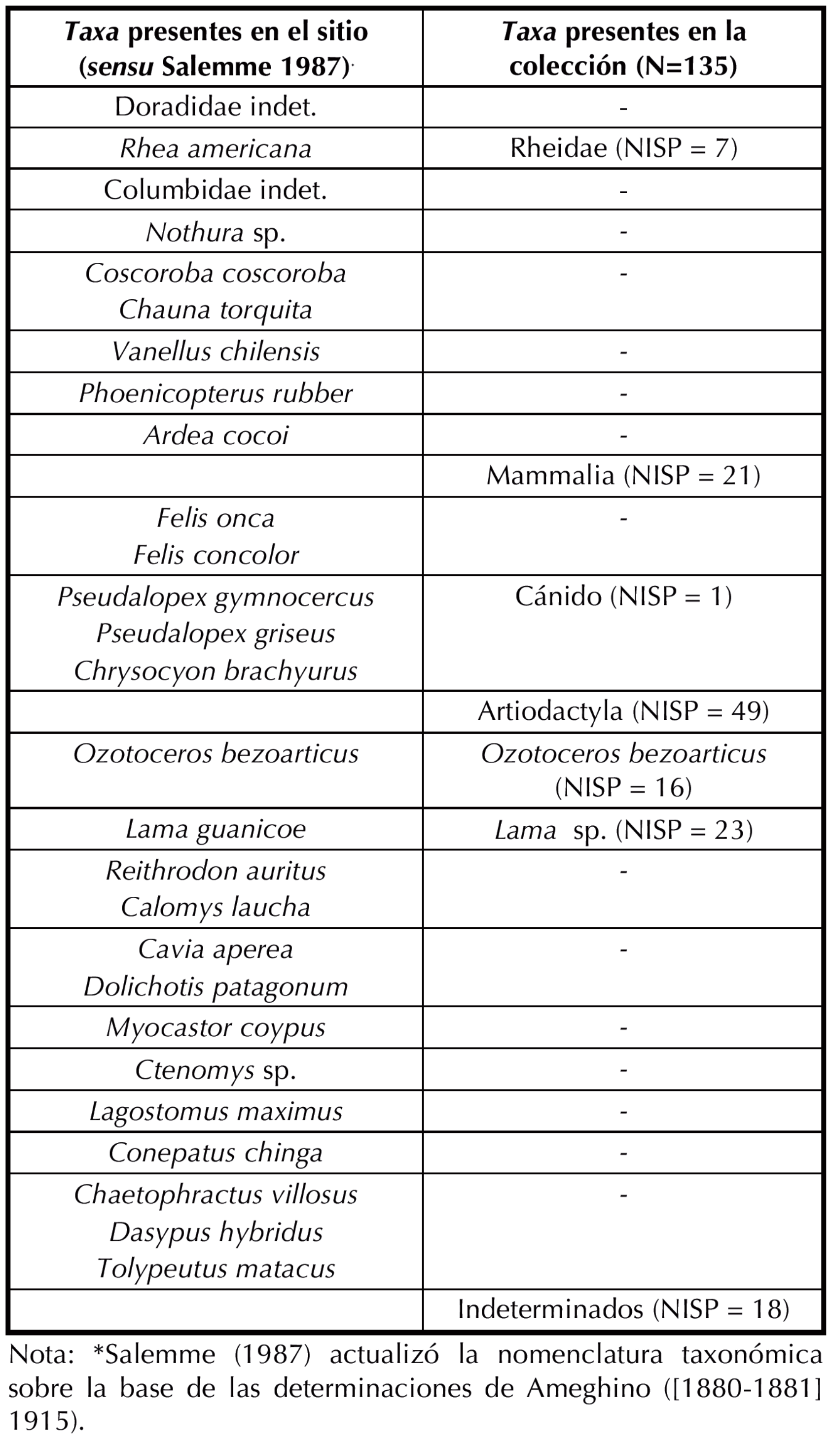 Ameghino ([1880-1881] 1915) determinó una gran diversidad taxonómica en Cañada Rocha; estos taxa fueron luego redefinidos bajo concepciones modernas por Salemme (1983, 1987) (Tabla 1). Sin embargo, los taxones que se pudieron establecer a partir de la muestra (n = 135) a la que se tuvo acceso para este trabajo fueron cuatro (Tabla 1). En tanto que las partes esqueletarias representadas en ella correspondieron a elementos del esqueleto apendicular y axial de camélido, mayormente del esqueleto axial de venado de las pampas y exclusivamente a elementos del esqueleto apendicular de ñandú y cánido (Tabla 1).