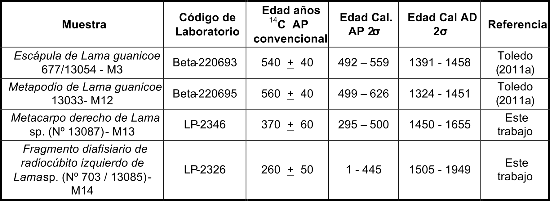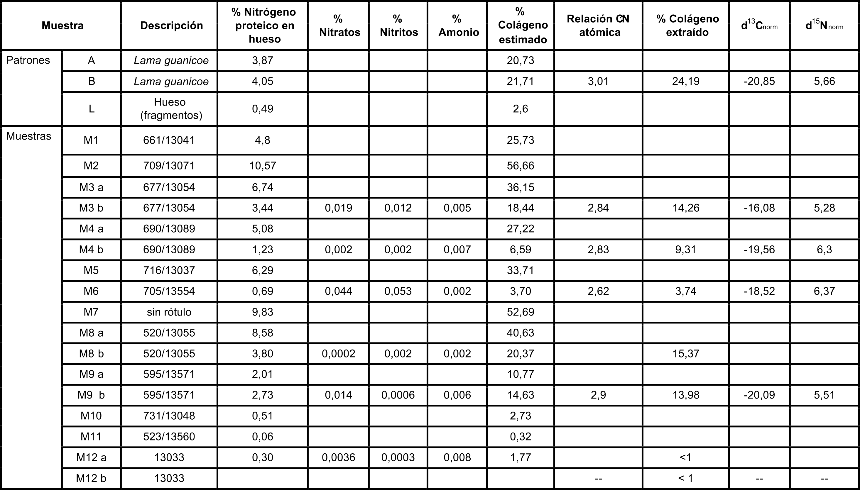 Las muestras M3 y M12, datadas por Toledo (2011a), presentan algunas anomalías. M3 tiene una relación C:N por debajo de los valores mínimos recomendados para datación (Ambrose 1990). Además, se detectó heterogeneidad en las muestras, ya que dieron diferentes valores de nitrógeno en distintas partes, anómalos ambos (con una diferencia absoluta de 4,21% entre el colágeno estimado y el extraído diferencia relativa porcentual mayor a 22%; segundo grupo), lo que evidencia presencia de nitrógeno no colágeno. La muestra M12 presentó un contenido de colágeno muy bajo (< 1%) en las dos porciones analizadas del mismo hueso, insuficiente para el cálculo de parámetros como la relación C:N (De Niro 1985).