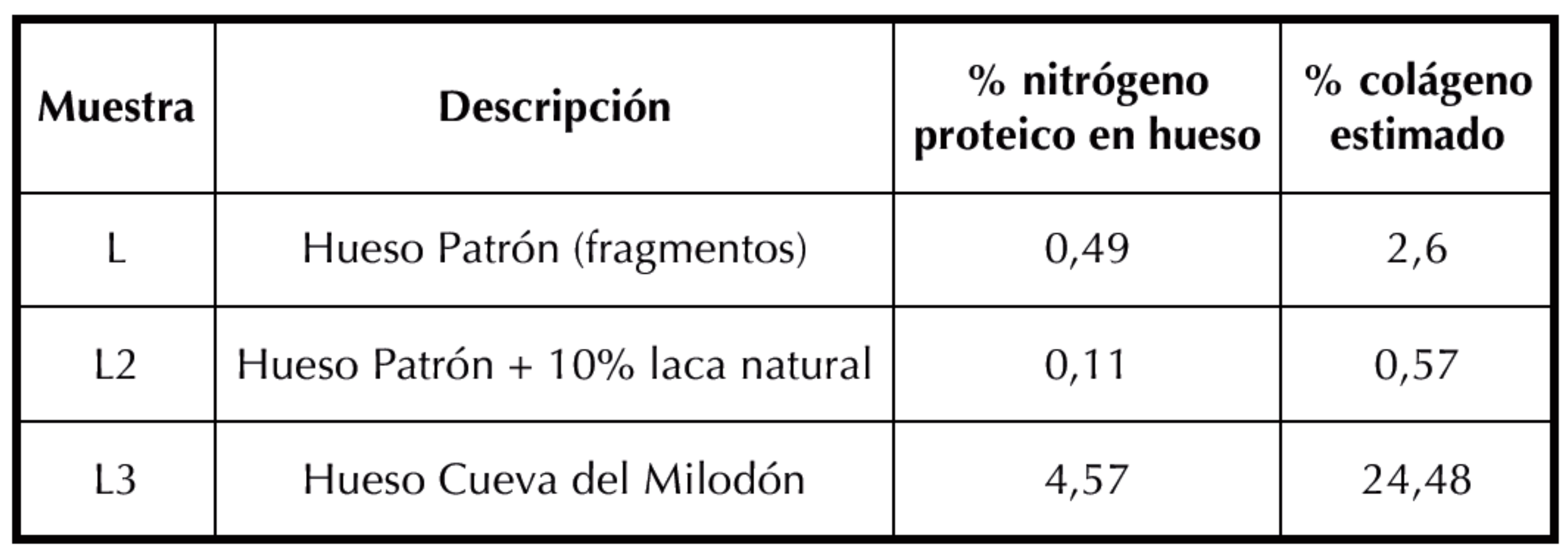 Cada determinación de nitrógeno se llevó a cabo por duplicado; a su vez, en aquellas muestras de las que se disponía de material se seleccionaron porciones en diferentes zonas del hueso (referidas como a y b), con la finalidad de confirmar homogeneidad. También se ensayó el agregado de goma laca (resina natural de origen animal, utilizada como agente protector de colecciones; muestra del Museo de La Plata), adicionando laca al hueso patrón L (L2) y analizando un hueso de colección que está conservado mediante laca natural proveniente de la Cueva del Milodón (L3) (material provisto por Eduardo Tonni). Este grupo de muestras se añadió con el fin de comprobar posibles alteraciones en el contenido de nitrógeno mediante la protección de los huesos de la colección con lacas de origen natural.