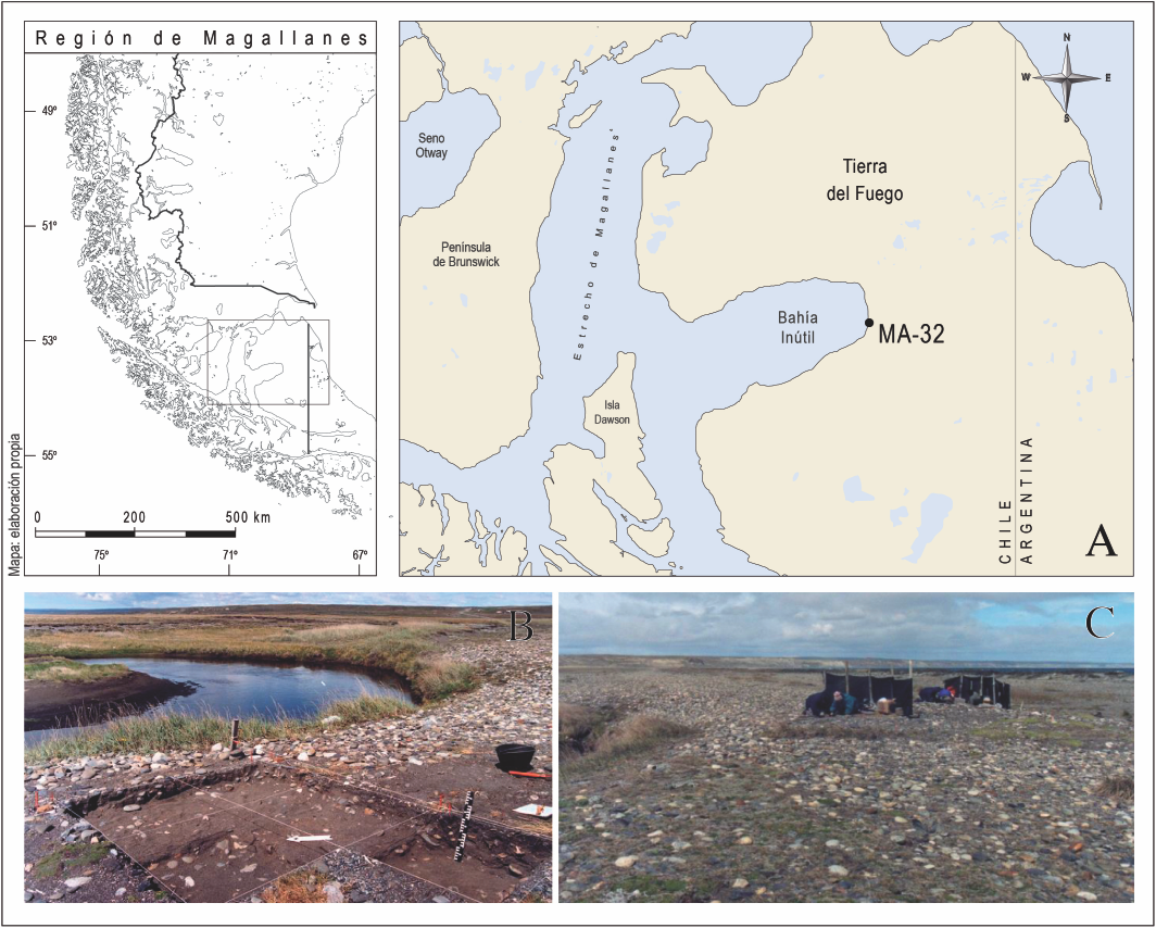 El sitio Marazzi 32 (MA-32) está ubicado en bahía Inútil, próximo a la desembocadura del río Marazzi (norte de Tierra del Fuego, Chile) (Figura 1). Corresponde a uno de varios registros costeros a cielo abierto y de tiempos tardíos (Massone et al. 2003; Massone y Morello 2007; Massone 2017), con fechados de entre 670 y 560 años AP (Tabla 1). Al inicio de las investigaciones se identificaron en superficie seis conjuntos con restos óseos de cetáceos depositados sobre una berma de playa ( Borella 2003), los cuales se extienden junto con otros restos de fauna por una superficie aproximada de 300 m2 (Massone y Morello 2007).