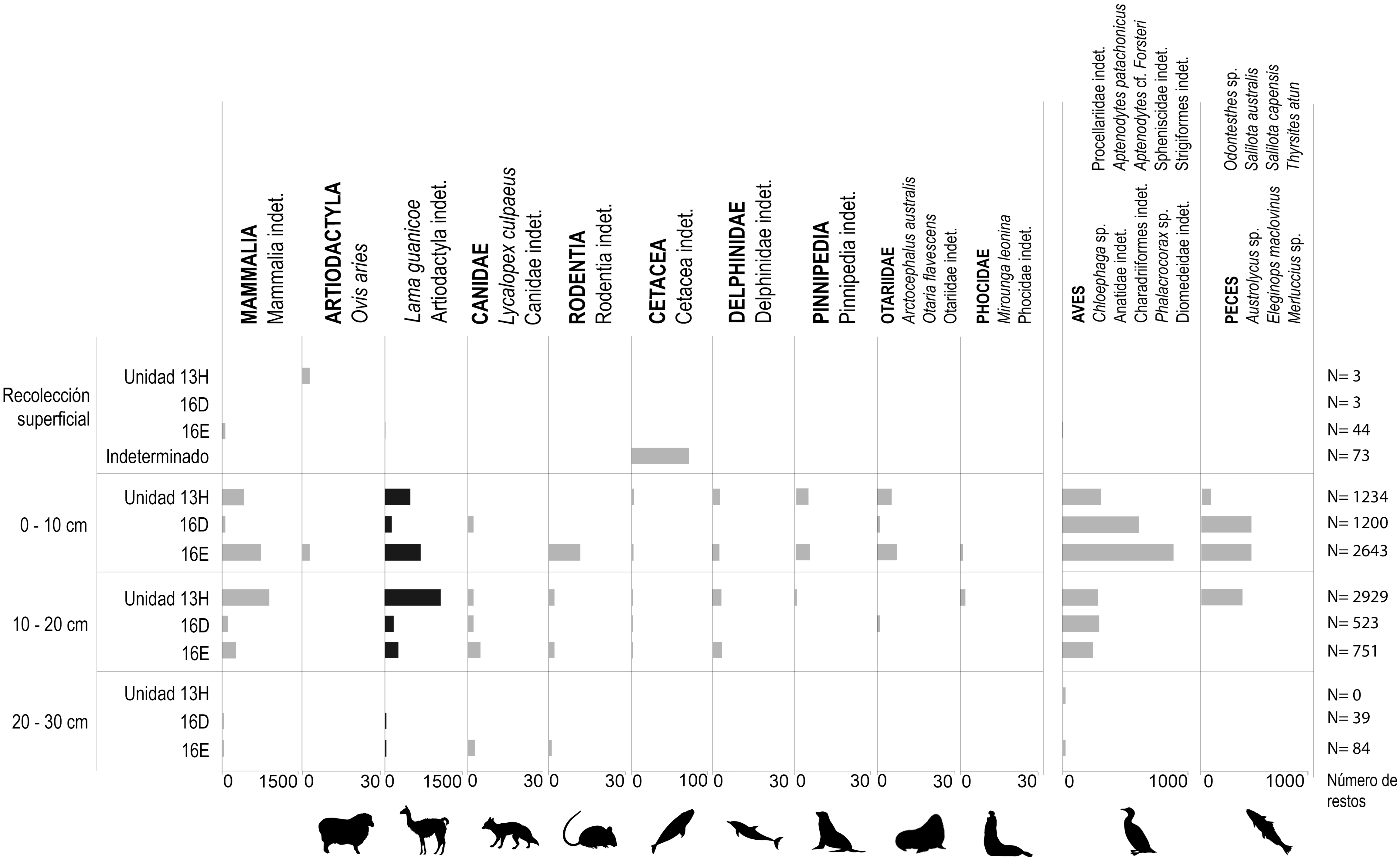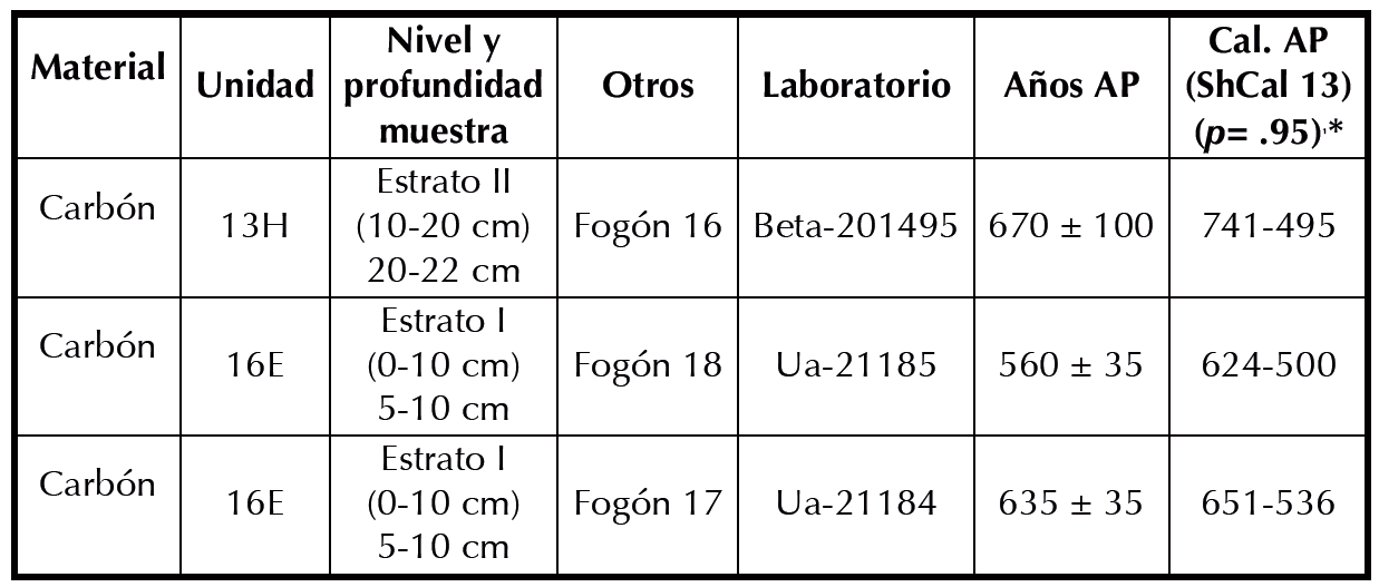 Nota: * Fechados radiocarbónicos calibrados a 2 sigma con el programa OxCal 4.3 v4.3.2 (Bronk Ramsey 2017); r.5: SHCal13 atmospheric curve (Hogg et al. 2013).Las diferentes campañas de excavación (2002-2004) permitieron la recolección sistemática de material arqueológico en tres unidades, denominadas 16D, 16E y 13H (de 2 × 2 m) y delimitadas por sectores (1, 2, 3 y 4) (Massone y Morello 2007). Entre los materiales líticos hallados allí se encuentran raspadores y grandes rodados astillados con filos naturales amplios (Massone y Morello 2007). Destacan en la arqueofauna gran cantidad de restos de guanaco y, en menor medida, otras especies de mamíferos terrestres y marítimos, además de aves, peces y escasos restos malacológicos.