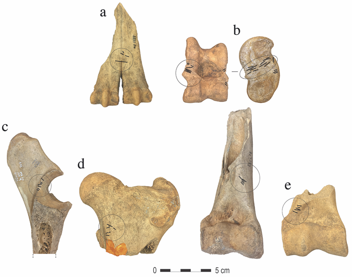 Huellas de corte registradas sobre: a. metapodio distal; b. astrágalos; c. epífisis proximal de radio-ulna; d. epífisis proximal de fémur –negativos de lascado en naranja–; e. epífisis distal de húmero.