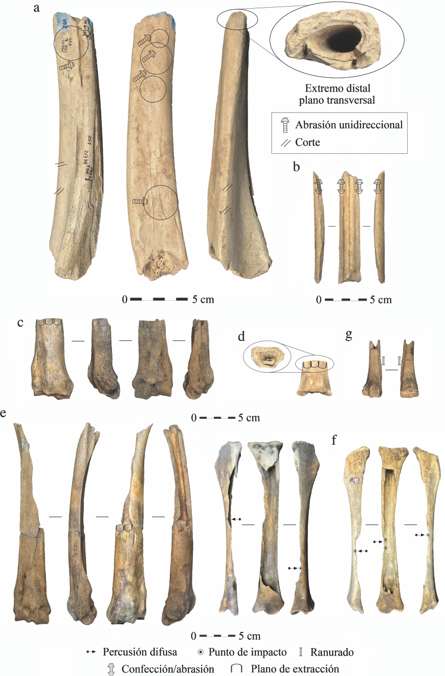 a. Percutor blando/retocador sobre tibia medial –en círculos cúpulas de hundimiento, en azul negativos de lascado–; b. espatuliforme sobre porción medial de metapodio; c. machacador sobre epífisis distal de radio-ulna; d. machacador sobre radio distal de individuo juvenil; e. fractura y obtención de machacador sobre radio-ulna medio distal; f. proceso de fracturación sobre porción medial de tibias de individuos juveniles; g. metapodio distal con ranurado sobre sección medial.