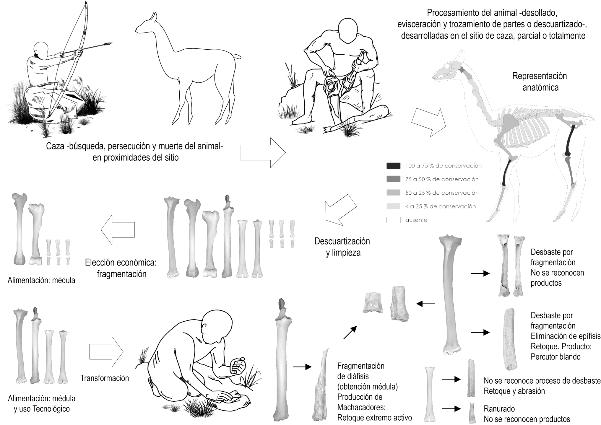 Los resultados obtenidos han sido resumidos en un esquema de las cadenas operativas relevadas para el sitio MA-32 (Figura 5), y dan cuenta de la representatividad de huesos de guanaco y la selección de piezas para la confección de artefactos óseos registrados en el sitio.