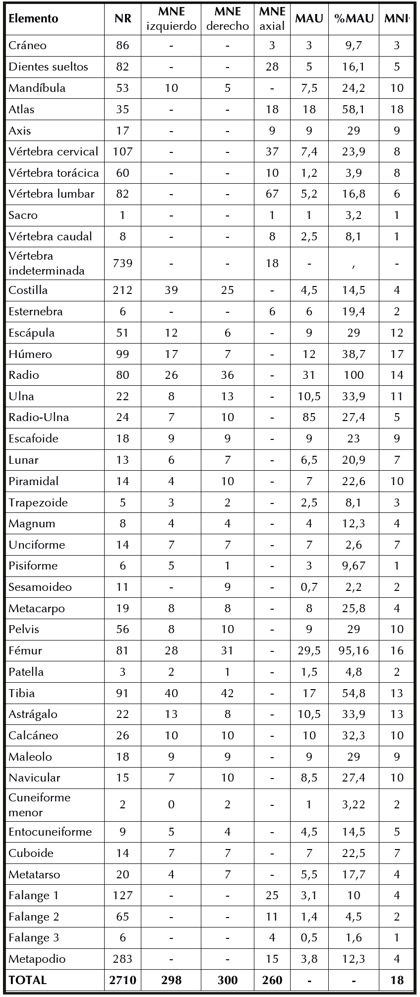 Entre los elementos anatómicos mejor representados del conjunto total se destaca la presencia de radio (mayor representatividad sobre elemento radio-ulna no fusionado con valor MAU del 100%), fémur (95,16% MAU), tibia (54,8% MAU) y metapodios (metacarpo con 25,8% MAU, metatarso con 17,7% MAU y metapodios con 12,3% MAU); estos últimos con un alto porcentaje de fracturas (44,54% para metapodios y 28,57% para tibias, sobre un total de 117 fracturas registradas). De los elementos anteriormente mencionados, un total de 37 restos (31,1%) presentan puntos de impacto, registrados principalmente sobre tibias y metapodios. Destaca dentro del conjunto un metapodio distal modificado en su superficie por medio de un surco ranurado (0,13%) (ver más adelante en resultados de análisis tecnológico).