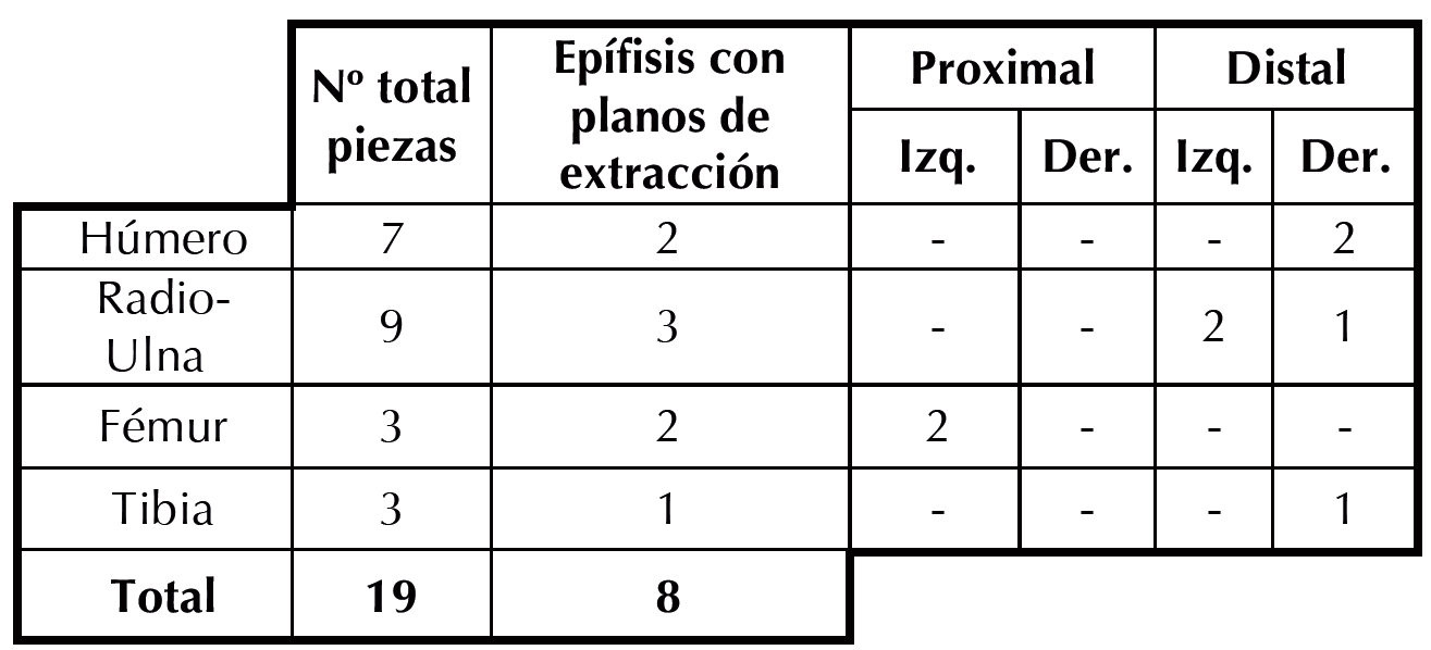 Finalmente se destacan ocho falanges primeras que comparten un patrón de fracturación posiblemente ligado al aprovechamiento de médula. La extracción de la sección medio-proximal del hueso carece de puntos de impacto, lo cual podría indicar que la fractura de las piezas fue realizada intencionalmente mediante la percusión desde el extremo medial o lateral de la falange.