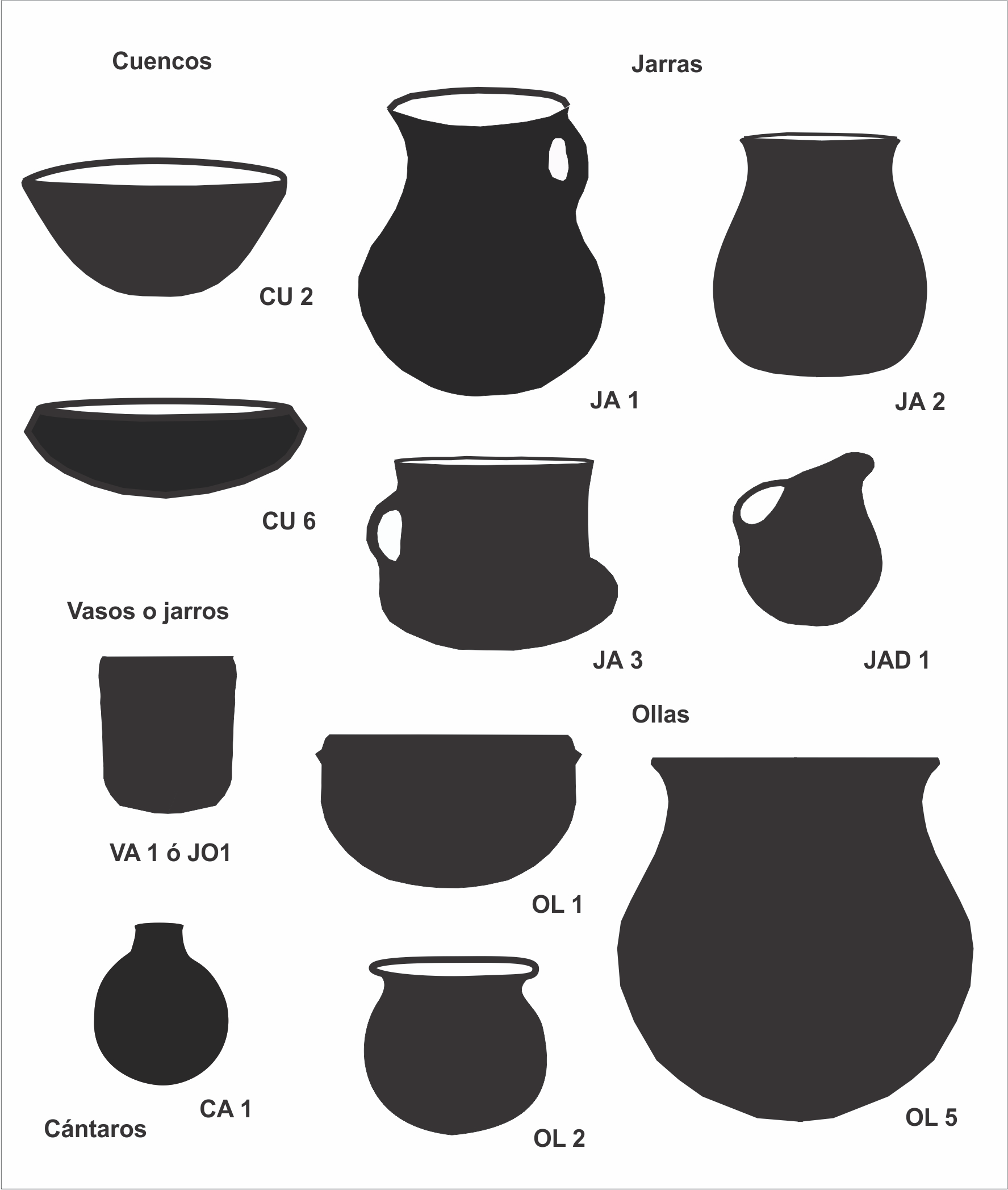 En la muestra se determinaron 30 recipientes, de los cuales, 19 corresponden a formas cerradas y 11 son abiertas. Entre las primeras, se registraron cinco ollas (dos de la variante OL5, dos de la OL2 y una de la variante OL1), seis jarras de distintas variedades (tres del tipo JA2 y una de cada variante JA3, JAD, JA1) y un cántaro (CA1). Otras 7 son cerradas pero su silueta completa no pudo determinarse. A las abiertas corresponden siete cuencos (cuatro de la variante CU2 y tres de la variante CU6), un vaso o jarro y tres indeterminadas.