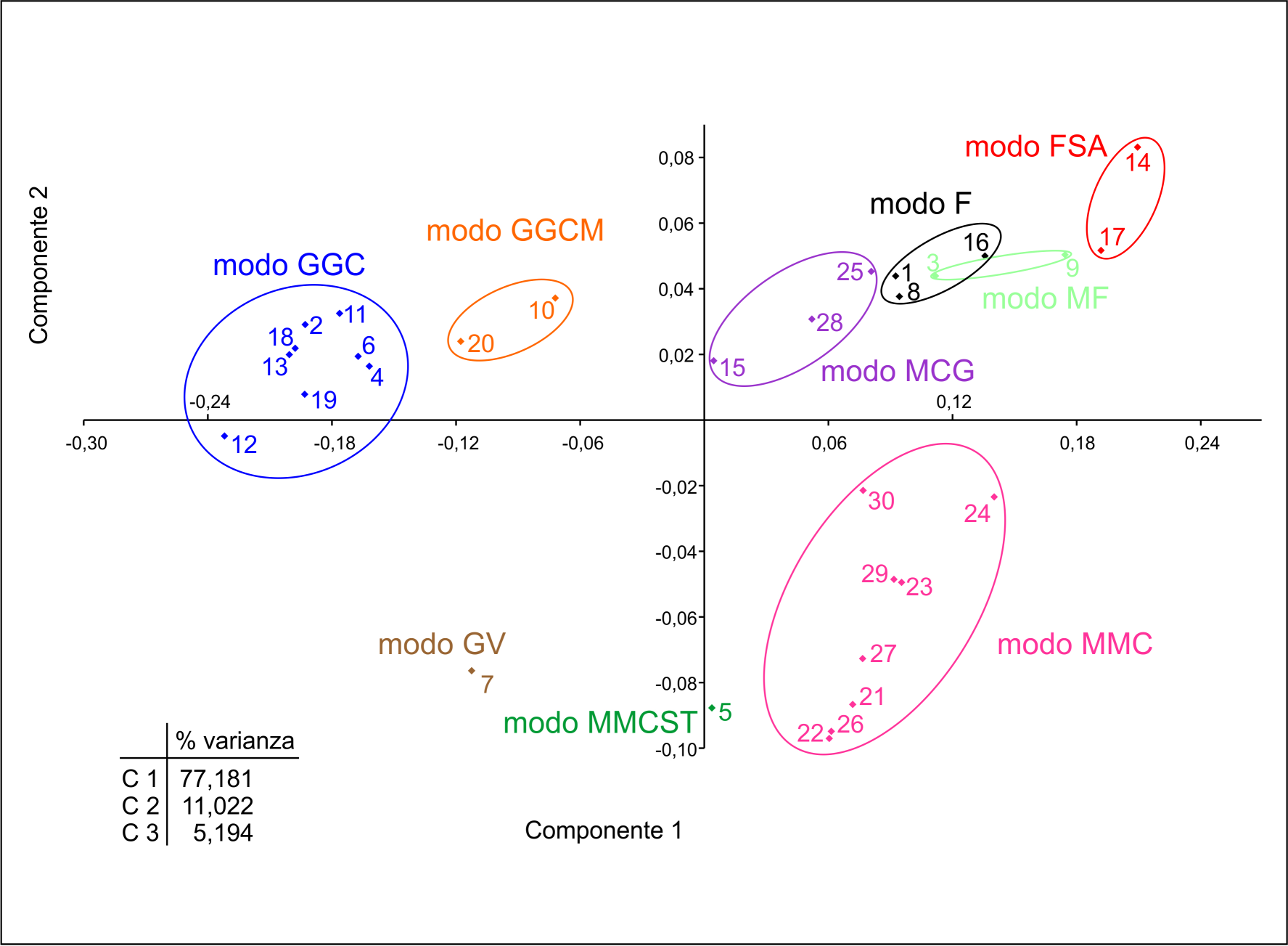 Se ensayó de modo exploratorio un ordenamiento de la muestra mediante el Análisis de Componentes Principales (ACP) provisto por el programa PAST versión 2.17 (Hammer et al. 2001). A partir de la combinación del ordenamiento de los datos cuantitativos, las descripciones cualitativas tanto de matrices, inclusiones como cavidades y las investigaciones previas en el área (Pereyra Domingorena 2012, 2015) se construyeron los modos de pasta de la cerámica arqueológica aquí estudiada.