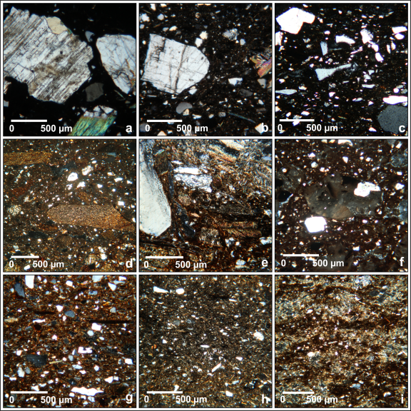 Fotomicrografías de los nueves modos de pastas registrados en Bordo Marcial. a) Modo Grueso Granítico-Cuarzoso [M 12]; b) Modo Grueso Granítico-Cuarzoso de densidad moderada [M 10]; c) Modo Medio Cuarzoso-Granítico [M 15]; d) Modo Medio Metamórfico-Cuarzoso [M 21]; e) Modo Medio Metamórfico-Cuarzoso sin tiesto [M 5]; f) Modo Grueso Volcánico [M 7]; g) Modo Fino [M 16]; h) Modo Muy Fino [M 9]; i) Modo Fino sin atemperante [M 14].