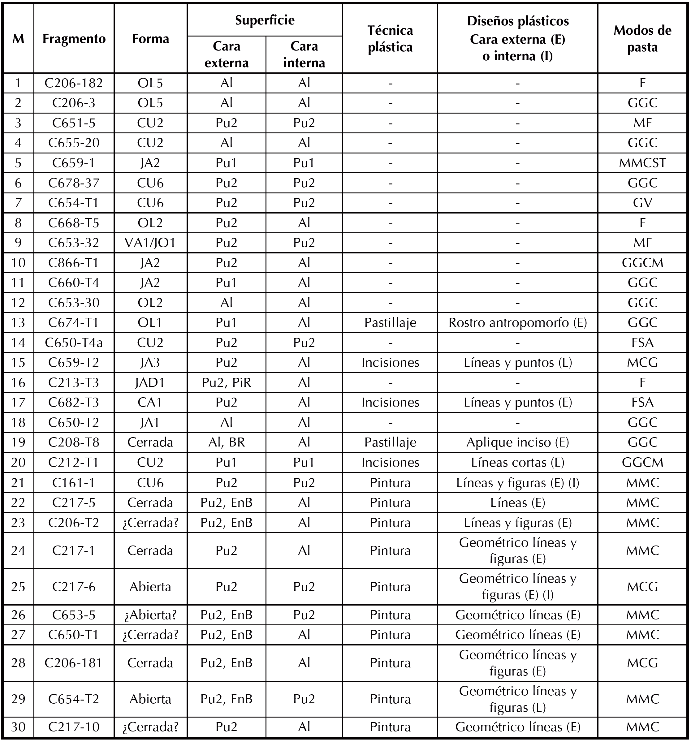 El empleo de estos criterios sobre el conjunto de 1255 tiestos hallados en la estructura E18 permitió determinar 25 vasijas hipotéticas. Además, se identificaron otras cinco piezas entre el material de recolección superficial del sitio. Sobre estos 30 recipientes se aplicó una metodología integradora que contempló los aspectos morfológicos, estéticos y técnicos de la cerámica.