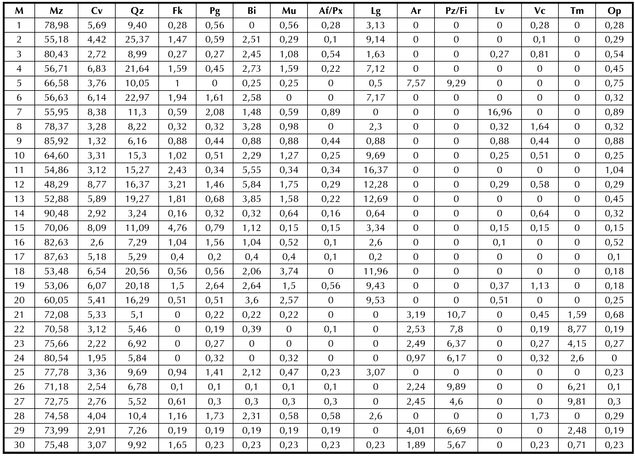 Variables analizadas ponderadas en porcentajes. Nota: M: muestra; Mz: matriz; Cv: cavidades; Qz: cuarzo; Fk: feldespato potásico; Pg: plagioclasas; Bi: biotita; Mu: muscovita; Af/Px: anfíboles y/o piroxenos; Lg: litoclastos graníticos; Ar: arenisca; Pz/Fi: pizarra y/o filita; Lv: litoclastos volcánicos; Tm: tiesto molido; Op: minerales opacos.