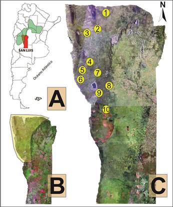 En este trabajo nos centraremos, exclusivamente, en los hornillos identificados en La Travesía del oeste y norte de San Luis (Figura 1). La región se corresponde fitogeográficamente, en su mayor parte, con el Chaco árido y, en el suroeste, incluye el ecotono con la provincia fitogeográfica del Monte (Cabrera, 1976; Karlin et al., 1994). Las precipitaciones muestran un gradiente decreciente este/oeste, con máximas de 500 mm y mínimas de 250 mm anuales (Servicio Meteorológico Nacional, 2000), con el 80% de las lluvias en la estación húmeda (diciembre-marzo). El clima es semiárido a árido, con gran amplitud térmica (13,7 ºC) y temperaturas medias máximas anuales de 24,4 ºC y mínimas de 10,7 ºC (Peña Zubiate y D’Hiriat, 2009). Tiene actualmente 0,7 hab/km. (Instituto Nacional de Estadísticas y Censo [INDEC], 2010). La población se concentra en pueblos pequeños, parajes de pocas viviendas o puestos aislados. Allí el agua es un recurso que atraviesa dimensiones políticas y sociales. Esto se observa en las estrategias gubernamentales para la recuperación de humedales, en la centralidad que cobra el agua en los reclamos durante la reemergencia del pueblo huarpe o en la importancia de las represas en la producción pecuaria (Calderón, 2015; Magliano et al., 2015).