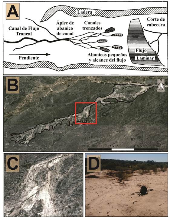 Geomorfológicamente, incluye las Sierras Occidentales, la Depresión Longitudinal Central y la Depresión Occidental Central, con una compleja evolución producto del levantamiento tectónico y cambios climáticos que afectaron el equilibrio entre erosión, transporte y sedimentación (González Díaz, 1981). Los cursos fluviales son efímeros y forman extensos valles con niveles aterrazados y llanuras de inundación con límites actuales difusos. En ese contexto, Candia (2015) identificó Corrientes Efímeras Discontinuas (en lo sucesivo, CED). Su origen, a escala global, es atribuido a una combinación entre precipitaciones, vegetación y acción humana en paisajes con lluvias medias anuales de entre 100 y 500 mm, pendientes menores a 2° y suelos con granos finos en su composición (Bull, 1997). Como menciona el autor, las CED tienen una secuencia repetitiva de degradación-agregación (con intervalos posibles de 15 m a 10 km): los cortes de cabeceras (cárcavas) concentran el flujo, un canal troncal transporta el agua al vértice de un abanico, los canales de distribución trenzados terminan en un área de flujo laminar divergente y luego un flujo laminar convergente drena los cortes de las cabeceras (Figura 2). Este proceso es un ajuste de los cursos a una modificación en la dinámica fluvial, asociada a una baja del nivel de base, cambio climático y/o acciones antrópicas (Bull, 1997; Miller, 2017, entre otros). Estos ajustes propician, en el área de estudio, la aparición de hornillos, ya sea por la degradación de amplias superficies a partir de erosión laminar o por las cárcavas que se forman en las cabeceras de los CED.