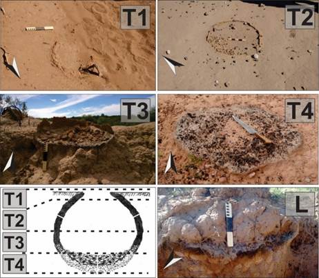 A partir de las observaciones realizadas se construyó una secuencia de los “estadios de deterioro” (Figura 3): T1 muestra la etapa inicial, cuando la boca es aún visible de modo total o parcial a nivel del suelo; T2 y T3 representan el momento en el que puede observarse el cuerpo (así como su relleno) en sus partes superior o inferior respectivamente; T4 es el período durante el cual es visible la parte inferior del hornillo, por lo general restos de carbón y/o cenizas y, en menor medida, pisos consolidados. Con la letra L se incorpora un tipo particular de fenómeno que afecta a los hornillos registrados, vinculado a la erosión por carcavamiento de la superficie.