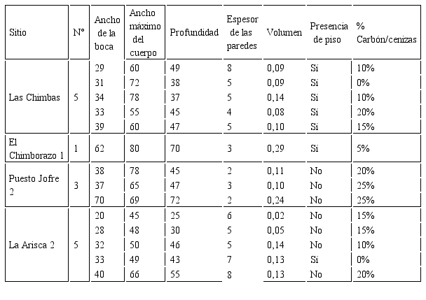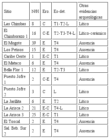 Las dataciones radiocarbónicas permiten posicionar a tres de los sitios en el Holoceno final. Bella Flor 1 corresponde al período prehispánico tardío (1320 +/- 30 BP; carbón; Beta-470123); el Chimborazo 1 es de momentos próximos al contacto hispano-indígena (540 +/- 30 BP; carbón; Beta-470120) y La Arisca 3 se ubica temporalmente en plena conquista española (330 +/- 30 BP; carbón; Beta-470124).