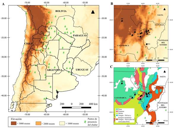 Los sitios escogidos en dirección este a oeste y el respectivo indicador de la especie fueron: Mortero Quebrado –leño carbonizado– (valle de Anfama); Yánimas 1 –indeterminado en la publicación original– (piedemonte sur de Tucumán); La Bolsa 1 –endocarpos– y Casas Viejas –endocarpos– (valle de Tafí); Puesto Viejo 2 –endocarpos– (quebrada de Los Corrales); Los Colorados –semillas–, Soria 2 –semillas–, y Tesoro 1 –endocarpo– (valle de Yocavil); Cardonal –endocarpos y semillas– (valle del Cajón); Los Viscos –endocarpos– (valle de El Bolsón); y Punta de las Peñas 9 –semilla– (puna).