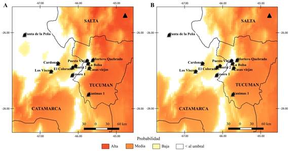 Los resultados obtenidos del modelo 3 permitieron generar dos mapas probabilísticos (i.e., tiempos presente y pasado; Figura 4), cuyos colores oscilan en una escala entre blanco (probabilidad de ocurrencia menor al umbral establecido del 10%) y rojo (probabilidad baja, de 0,38-0,52%; probabilidad media, de 0,52-0,65%; y probabilidad alta, de 0,66-0,8%).