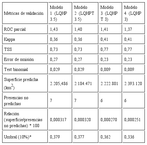 Una vez seleccionados los puntos y las variables bioclimáticas, el MDE por defecto para la especie en MaxEnt fue evaluado con la librería en R ENMeval (Muscarella et al., 2017). Esto permitió probar un conjunto de variables predictoras ("feature classes", Fc) junto con diferentes valores de penalización por complejizar el modelo (“regularization multiplier”, Rm), lo que dio como resultado 48 modelos diferentes de MaxEnt, de los cuales se eligieron los cuatro con los valores más bajos del criterio de información de Akaike corregido (AICc) y tasa de omisión más baja (datos de presencia real de la especie que fueron clasificados como ausencia por el modelo). Posteriormente, los cuatro modelos se validaron con las herramientas provistas en Niche Tool Box (Osorio-Olvera et al., 2018) utilizando ROC parcial (Peterson et al., 2008), prueba binomial (Anderson et al., 2002), error de omisión (falso negativo de Fielding y Bell, 1997), “true skill statistic” (TSS) (Allouche et al., 2006), Kappa (Cohen, 1960) y la relación puntos de presencia no predichos/superficie predicha (km.) (Camps et al., 2018), con el objetivo de seleccionar el mejor de los cuatro. La validación se realizó con el 30% de puntos de presencias apartados inicialmente y seis puntos de ausencias conocidas de la especie.