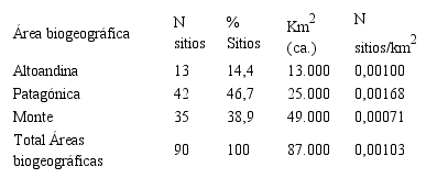 De los 96 sitios con arte registrados, 74 (77,1%) poseen información sobre el tipo de morfología del soporte en que se encuentran emplazados (e.g., cueva, alero, etc.) y 57 de ellos (77% de 74), sobre su materia prima rocosa (e.g., basalto, ignimbritas). Sin embargo, los criterios y términos utilizados en la bibliografía para caracterizar los sitios no siempre están explicitados ni son sistemáticos, lo cual genera ambigüedades al momento del registro de las variables y su posterior análisis2. Una evaluación conservadora de los tipos de morfologías y materias primas rocosas de los soportes utilizados indica, por un lado, la utilización de afloramientos rocosos de ignimbrita (n = 35; 61,4%) y basalto (n = 22; 38,6%); por otro lado, una mayor utilización de emplazamientos no reparados (e.g., paredones y bloques: n = 42; 56,7%), por sobre los reparados (e.g., aleros y cuevas: n = 32; 43,3%). Esta última tendencia difiere entre las áreas biogeográficas; así, mientras que en Monte y Altoandina predominan los emplazamientos reparados por sobre los no reparados (n = 16 vs. n = 7 y n = 6 vs. n = 2, respectivamente), en Patagonia se produce lo contrario (reparados: n = 10; no reparados: n = 31).