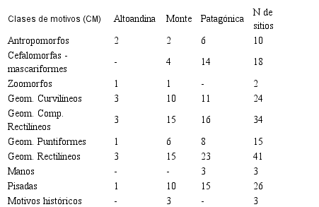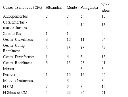 Las clases de motivos fueron definidas agrupando tipos de motivos vinculados entre sí por afinidades formales (utilizando criterios tales como si el motivo está compuesto por líneas rectas, curvas, figuras perimetrales, figuras de cuerpo lleno, etc.) y temáticas (utilizando criterios relativos a la identificación del referente representado, cuando este es reconocible, tales como mascariforme-cefalomorfo o pisadas). La elección de esta categoría amplia para el análisis formal de las imágenes (por encima de categorías como grupo o tipo de motivo) respondió a la necesidad de abarcar motivos descriptos en la bibliografía con diferentes grados de detalle. Estas clasificaciones, aun siendo actuales y occidentales, sirven como herramienta para el análisis sistemático de las producciones visuales y la búsqueda de tendencias generales en el uso de las formas (Hernández Llosas, 1997).