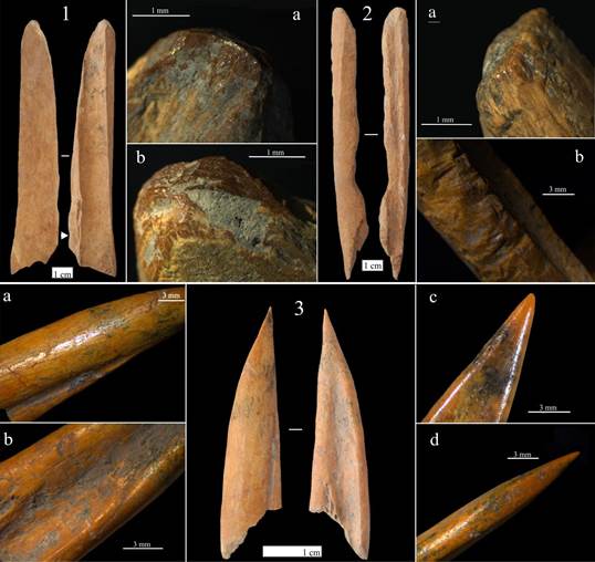 La punta roma (Figura 2; nº 2) fue confeccionada sobre una diáfisis de hueso largo. Se encuentra entera y presenta una sola extremidad activa (Tabla 1). En este sector, a nivel microscópico, se observan pulido y estrías en dirección perpendicular y diagonal al eje longitudinal del hueso (Figura 2; n° 2a). En una porción del extremo proximal se identificaron tres huellas de corte agrupadas, dispuestas de manera diagonal al eje longitudinal del hueso. Además, se registraron marcas de roedores en todas las superficies de fractura (Figura 2; n° 2b) y adherencias de carbonato de calcio que impidieron identificar la potencial existencia de otros rasgos técnicos. El tercer instrumento (Figura 2; nº 3) corresponde a una punta confeccionada en una diáfisis de hueso largo de venado de las pampas (Tabla 1). Se encuentra fracturado en su extremo proximal, presenta una extremidad activa de morfología aguzada y fue clasificado como un punzón (sensu Camps-Fabrer, 1966). Si bien está íntegramente pulido (Figura 2; n° 3a-d), aún puede distinguirse la cavidad medular del hueso soporte (Figura 2; n° 3b). Se registraron escasas huellas de corte en la cara anterior, dispuestas de manera diagonal al eje longitudinal, sobre su extremo proximal. Además, posee marcas de raíces, tinciones de manganeso y adherencias de carbonato de calcio, en baja intensidad (Tabla 1).
