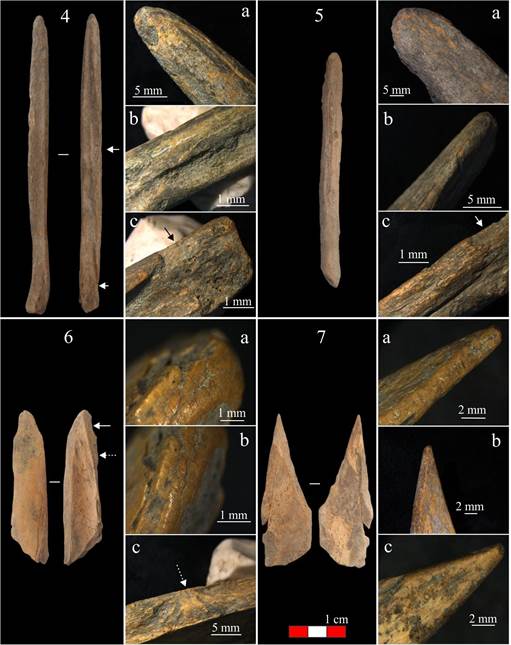 En ZA1 CS se recuperaron ocho instrumentos óseos, seis de ellos realizados con huesos de guanaco, uno en un hueso de artiodáctila, y el restante, sobre un hueso de venado de las pampas (Tabla 1). Entre los primeros se identificaron cuatro con una sola extremidad activa, que corresponden a tres puntas romas y una punta aguzada (Tabla 1). Para la confección de aquellos instrumentos con extremidades activas de morfología roma (Figura 3; n° 4, 5 y 6) se emplearon dos diáfisis de metapodio (una de las cuales conserva parte de la epífisis proximal) y un fragmento de diáfisis de fémur. Con relación al análisis tecnológico, en el caso de los instrumentos confeccionados sobre metapodios, el espécimen n° 4 (Figura 3) fue realizado sobre un desecho de fractura. Este instrumento se encuentra entero y su soporte fue originado como consecuencia de dos golpes, uno sobre la metáfisis y otro sobre la línea de la cara anterior del hueso (Figura 3). Se observó la presencia de pulido en algunos sectores de la cara interna del instrumento, sobre la superficie de fractura del desecho soporte (Figura 3; n° 4a, b y c). El instrumento presenta depositaciones de carbonato de calcio en toda su superficie y marcas de roedores sobre los bordes de fractura. Estas modificaciones impiden identificar la posible presencia de otros rasgos técnicos. El instrumento n° 5 (Figura 3) se encuentra entero y fue confeccionado a partir de un fragmento de díafisis de un metapodio. La presencia de una boca de lascado sobre la cara interna (Figura 3; nº 5c) indica que la obtención del soporte pudo resultar de la fracturación de la diáfisis de manera paralela al eje longitudinal del hueso. Si bien se observaron depositaciones de carbonato de calcio y marcas de roedores a lo largo de todo el hueso, se pudo apreciar la presencia de algunos rasgos técnicos, como el pulido en algunos sectores de la cara interna (Figura 3; n° 5a, b y c). Siguiendo la clasificación de Camps-Fabrer (1966), ambos instrumentos pueden considerarse retocadores (Figura 3; n° 4 y 5). El instrumento nº 6 (Figura 3) se encuentra entero, presenta una punta roma y fue realizado sobre un desecho de fractura de fémur que se originó como consecuencia de un golpe en el borde mesial de la diáfisis (Figura 3). Se observa la presencia del cono de percusión de la lasca soporte y de un negativo de lascado anterior a este (Figura 3; n° 6c). La extremidad activa es el único sector que se encuentra pulido y presenta estrías ubicadas de manera perpendicular al eje longitudinal del hueso (Figura 3; n° 6a y b). Respecto de las modificaciones tafonómicas, se observan en baja proporción marcas de raíces, tinciones de manganeso y depositaciones de carbonato de calcio, principalmente en la extremidad activa. El instrumento que presenta una sola extremidad activa en forma aguzada (Figura 3; nº 7) fue realizado sobre un fragmento de diáfisis de tibia y puede clasificarse como un punzón sensu Camps-Fabrer (1966). Este soporte no presenta rasgos técnicos claros. Solo la extremidad activa se encuentra pulida y presenta estrías perpendiculares al eje longitudinal del hueso sobre uno de sus bordes (Figura 3; n° 7a, b y c). Con respecto a las alteraciones tafonómicas, posee concreciones de carbonato de calcio y tinciones de manganeso en casi toda su superficie. Estas modificaciones pueden condicionar la identificación de rasgos (Tabla 1).