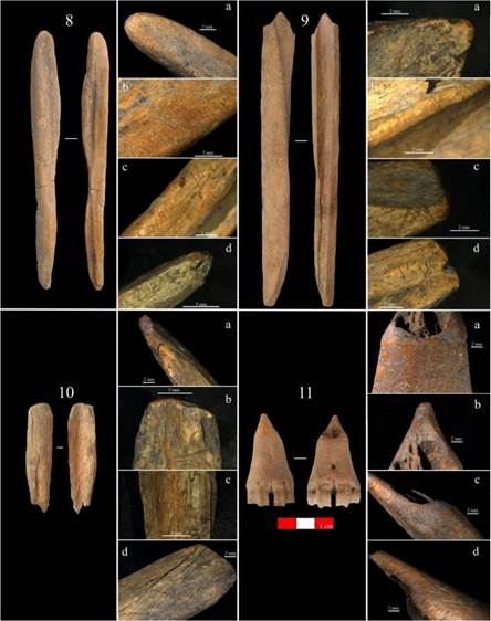El instrumento confeccionado sobre un hueso de venado (Figura 4; nº 11) corresponde a una punta aguzada realizada a partir de la epífisis distal y metáfisis de un metapodio (Tabla 1). A la altura de la metáfisis se observa una línea demarcada por medio del aserrado de la cara anterior del hueso (Figura 4; n° 11a y b). Este instrumento se encuentra entero y podría corresponderse con un punzón tipo III sensu Camps-Fabrer (1966). A nivel microscópico pudieron identificarse, en su parte activa, estrías paralelas y perpendiculares al eje longitudinal del hueso (Figura 4; n° 11b, c y d). Con respecto a las variables tafonómicas, solo se observaron marcas de raíces. Si bien estas se distribuyen en casi toda la superficie, permitieron identificar los rasgos asociados a la formatización de dicho instrumento (Tabla 1).