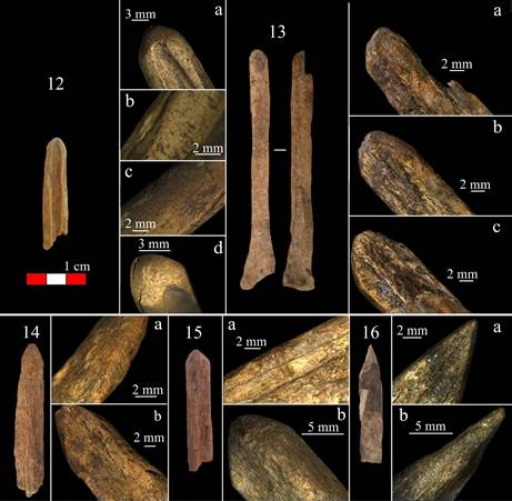 En este sitio se recuperaron cuatro instrumentos confeccionados sobre huesos de guanaco (Tabla 1). Tres de ellos corresponden a puntas romas (Figura 5; n° 13, 14 y 15), y el restante, a una punta aguzada (Figura 5; n° 16). Las primeras fueron realizadas sobre diáfisis de metapodios. El instrumento n° 13 se encuentra fracturado y presenta parte de la epífisis proximal del hueso soporte, sobre el cual se identificó la presencia de un negativo de lascado (Figura 5; nº 13). En base a la morfología que presenta la epífisis proximal, posiblemente haya sido modificada. A nivel microscópico se observan, en la extremidad activa, pulido y estrías perpendiculares al eje longitudinal del hueso (Figura 5; n° 13a, b y c). También se identificaron marcas de raíces que afectaron a la mayor parte de la superficie del hueso, lo que no permite distinguir la posible presencia de pulido en el resto de la pieza (Tabla 1). Este instrumento puede considerarse un retocador sensu Camps-Fabrer (1966). El instrumento nº 14 (Figura 5) fue realizado a partir de un fragmento de diáfisis de metapodio y se encuentra fracturado en su extremo proximal. A nivel microscópico, presenta evidencias de pulido en toda la cara interior y en la extremidad activa (Figura 5; n° 14a y b), así como estrías paralelas y perpendiculares al eje longitudinal del hueso en este último sector (Figura 5; n° 14b). En cuanto a las alteraciones tafonómicas, presenta evidencias de meteorización y marcas de raíces que pudieron obliterar la posible existencia de otros rasgos técnicos (Tabla 1). El instrumento nº 15 se encuentra fracturado; se recuperaron solo las partes mesial y distal de la pieza, por lo cual resulta difícil establecer la porción de hueso de la que fue obtenido el soporte (Figura 5). Tanto a nivel macro como microscópico se observa una importante abrasión que erosionó toda la superficie cortical del hueso, lo que impide reconocer otras modificaciones tafonómicas (Tabla 1). Sin embargo, en algunos sectores de la cara anterior del hueso pudo identificarse la presencia de pulido y de estrías perpendiculares a su eje longitudinal en el borde de la extremidad activa (Figura 5; n° 15a y b). Este instrumento puede considerarse un retocador siguiendo la clasificación de Camps-Fabrer (1966). El cuarto instrumento (Figura 5; nº 16) es una punta aguzada confeccionada a partir de un fragmento de diáfisis de un hueso largo y se encuentra fracturada en su parte proximal (Tabla 1). Si bien no pudieron identificarse rasgos técnicos relacionados con la obtención del soporte, a nivel microscópico se observan estrías dispuestas de manera perpendicular y diagonal al eje longitudinal del hueso en toda la extremidad activa (Figura 5; n° 16a). En este mismo sector del hueso se identificó también la presencia de pulido (Figura 5; n° 16b). Se registraron, además, marcas de raíces y tinciones de manganeso. Sin embargo, su presencia no impidió identificar los rasgos técnicos observados en la extremidad activa. De acuerdo con la clasificación de Camps-Fabrer (1966), este instrumento correspondería a un punzón.