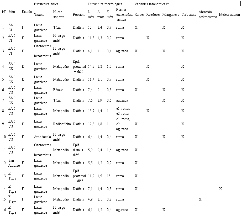 Finalmente, para evaluar la acción de distintos agentes y/o procesos sobre los huesos, se llevó a cabo el análisis de las siguientes variables tafonómicas: meteorización, marcas de raíces, carbonato de calcio, tinciones de manganeso, abrasión sedimentaria, marcas de roedores, carnívoros y pisoteo (Behrensmeyer, 1978; Binford, 1981; Olsen y Shipman, 1988; Montalvo, 2002).