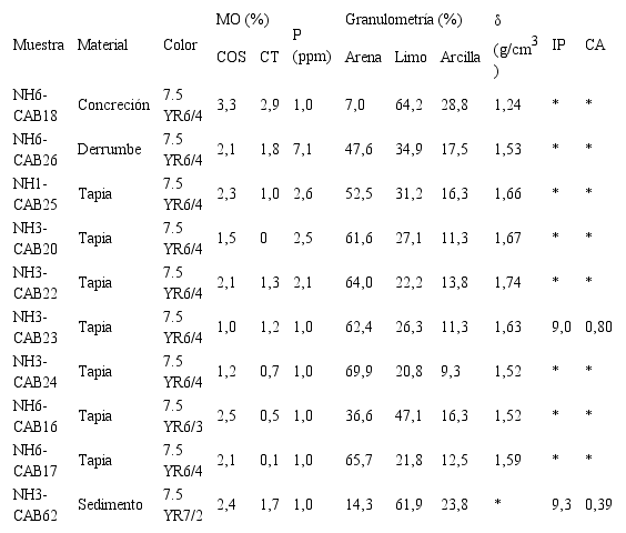Con respecto a los análisis texturales, la mayoría de los materiales muestran texturas franco-arenosas. Se observa que, mientras la variación en la composición textural presenta correlaciones negativas para el caso de la asociación entre arena-limo y arena-arcilla, la correlación limo-arcilla muestra una tendencia positiva. En líneas generales, los vestigios de tapia se manifiestan más arenosos (>61%), con contenidos de limo entre 20-27% y de arcilla inferiores al 14%. La excepción a esta tendencia está representada por las muestras NH6-CAB16 y NH1-CAB25, que presentan valores de arena entre 36-53%, contenidos de limo superiores al 30%, y de arcilla, por encima del 16%. A su vez, mientras que la muestra de concreciones presenta valores intermedios para las tres clases texturales, las muestras de derrumbe y sedimento de control manifiestan una tendencia completamente diferente, con valores relativamente bajos de arena (7-14%), altos de limo (62-64%) e intermedios de arcilla (23-29%).