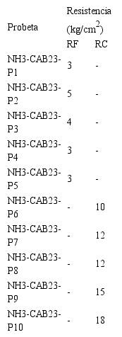 Finalmente, solo en la muestra NH3-CAB23 pudo determinarse la resistencia mecánica del material, dado que guardaba los requerimientos de volumen y cohesión necesarios para el ensayo. Los estudios realizados sobre distintas probetas extraídas de esa muestra aportaron valores bajos en RF y altos en RC, con rangos que van entre 3-5 kg/cm., promedio de 3,8 kg/cm.; y 10-18 kg/cm., promedio de 13,4 kg/cm., respectivamente (Tabla 2).