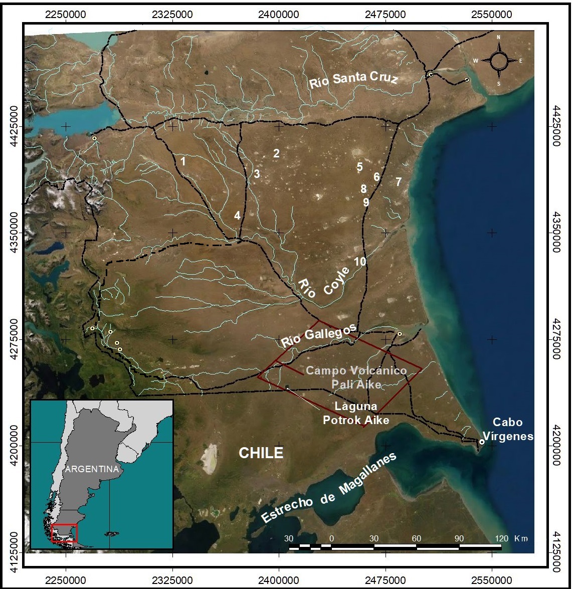 La cuenca del río Coyle es una de las más extensas del sur de Santa Cruz (Figura 1). Su paisaje fue modelado por la acción glacifluvial y está compuesto por varios niveles de terrazas y mesetas sedimentarias planas de origen continental y marino. La escasa cobertura edáfica y vegetal facilita la erosión hídrica (Cáceres y Caballero, 2006). Es un ambiente de estepa graminosa xérica y arbustiva (Cuadra y Oliva, 1996). En su cuenca media e inferior no posee cuevas ni aleros debido a la escasa compactación del sedimento Terciario (Carballo Marina et al., 2000-2002); estos abrigos solo se encuentran en las coladas basálticas de las márgenes de los ríos Santa Cruz y Gallegos, que enmarcan a la cuenca del río Coyle por el norte y el sur respectivamente.