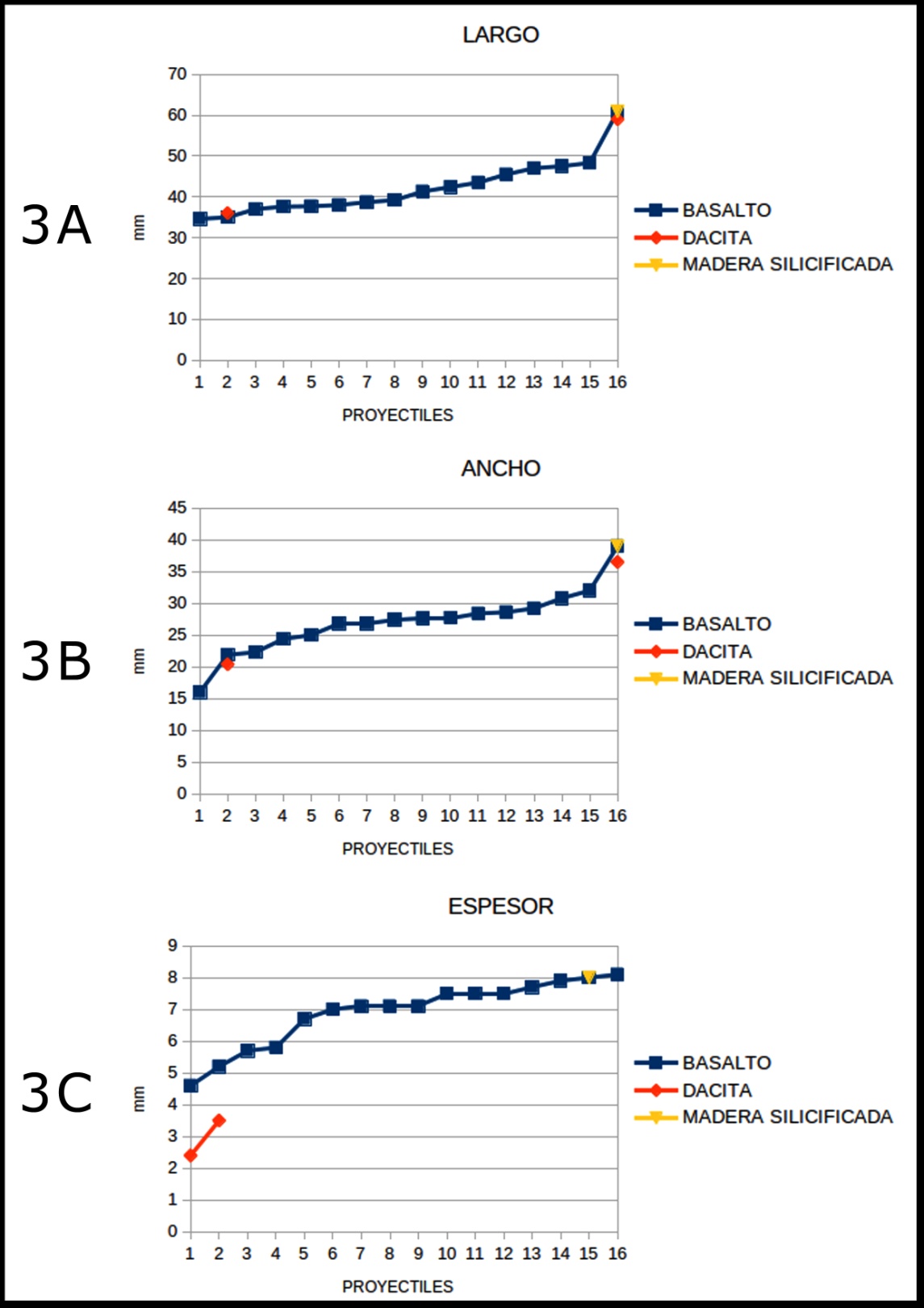 Las puntas de basalto son las que presentan mayor frecuencia de ejemplares enteros. Su longitud tiene una distribución relativamente homogénea, dado que el 60% mide entre 35 y 47 mm, con valores extremos de 34,6 mm y 60,9 mm (Figura 3 A). El ancho se muestra aún más homogéneo; el 70% se presenta entre 20 y 30 mm, y los valores extremos son 16 mm y 39 mm (Figura 3 B). Por último, el espesor concentra un 60% de la muestra entre 6,7 y 7,7 mm, con valores extremos de 4,6 mm y 8,1 mm (Figura 3 C). Las puntas de dacita y madera silicificada son levemente más largas, mientras que el ancho se ubica en los valores promedio (Figuras 3 A, B y C) y pertenecen al subgrupo tipológico pedúnculo diferenciado y hombros, y las más pequeñas, al subgrupo tipológico pedúnculo diferenciado y aletas entrantes. Se observaron diferencias importantes entre los espesores de los limbos y de la raíz de los pedúnculos en siete ejemplares, dos de dacita y cuatro de basalto de pedúnculo diferenciado y aletas, y una en RGFO del subgrupo pedúnculo diferenciado y hombros.