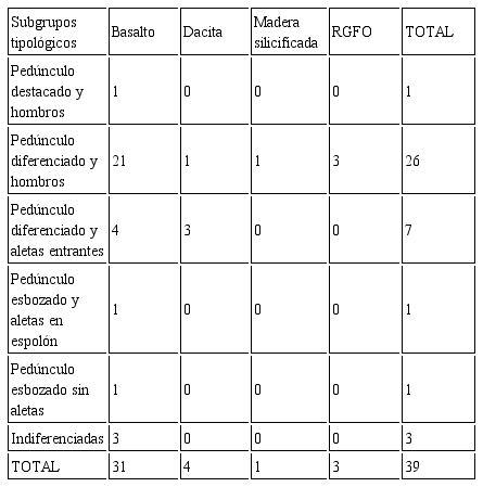 El subgrupo más frecuente, de pedúnculo diferenciado y hombros, se inclina hacia la sección biconvexa (n = 17, 65,38%), y el 34,61% (n = 9), a la planoconvexa. El subgrupo pedúnculo diferenciado y aletas presenta secciones biconvexas (n = 3) y planoconvexas (n = 3) en la misma proporción.